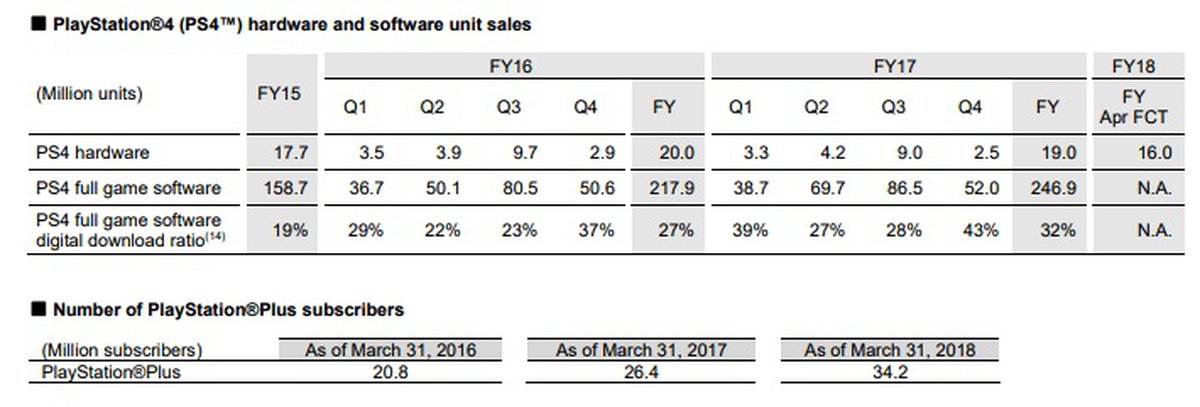 Снижение продаж PlayStation 4 будет компенсироваться растущими продажами игр. За 2017 финансовый год Sony продала 246.9 миллионов копий игр для PlayStation 4, примерно треть из них была реализована в цифровом виде. Общее число проданных игр для PlayStation 4 вот-вот превысит 700 миллионов копий.