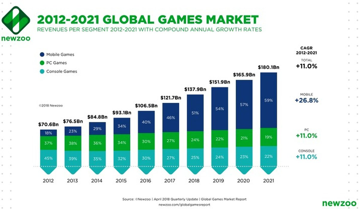 Исследователи компании Newzoo опубликовали прогноз по доходам игровой индустрии на 2018 год. В компании считают, что в этом году больше половины выручки впервые сгенерируют игры для мобильных платформ.