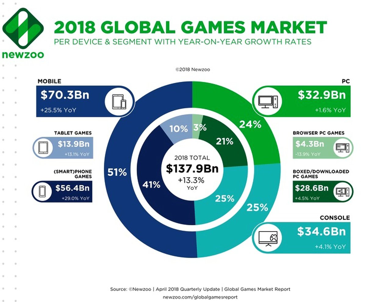 Общий объем рынка аналитики Newzoo оценивают в $137.9 миллиардов, мобильные устройства заработают больше $70.3 миллиардов — на 25.5% больше, чем в 2017 году. Активнее всего будет расти направление игр для смартфонов: в Newzoo считают, что выручка здесь вырастет на 29%, до $56.4 миллиардов.