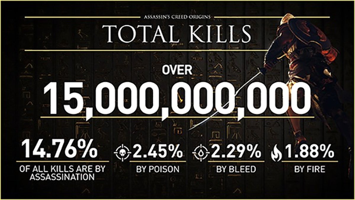 Оказалось, что за это время игроки успели совершить в Assassin’s Creed Origins больше 15 миллиардов убийств. Большая часть жертв, видимо, пала в открытом бою: скрытно было совершено только 14.76% убийств. В еще 2.45% случаев жертва погибала от яда, 2.29% смертей приходится на кровотечение, а 1.88% жизней забрало пламя.