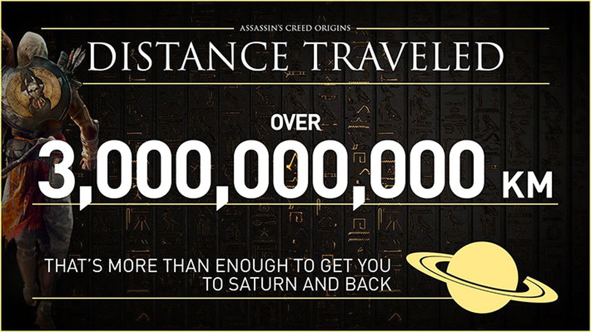 И, наконец, пешком, в седле и на лодках игроки проехали (и проплыли) по Древнему Египту и окрестностям свыше 3 миллиардов километров. Это расстояние больше, чем путь от Земли до Сатурна и обратно.