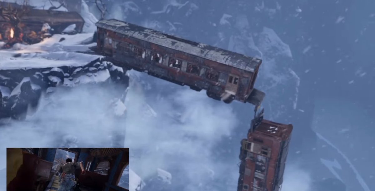 Драматичная сцена с пробежкой через падающий в пропасть вагон тоже выглядит несколько иначе. На самом деле поезд не слышал про физику: вагон аккуратно съезжает со склона словно по невидимой площадке, а затем не особенно кинематографично рушится в бездну. Но от лица Нейтана, признаем, все смотрится просто отлично.