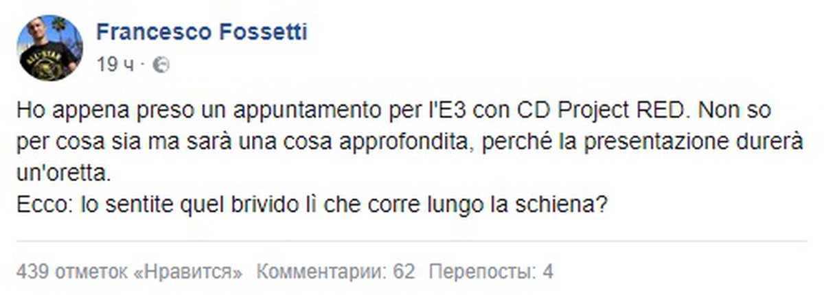 По словам Фоссетти, он уже получил приглашение на презентацию польской студии. Сам Франческо понятия не имеет, о чем пойдет речь, однако из-за длительности мероприятия журналиста полагает, что разработчики покажут нечто очень серьезное. Дату проведения презентации Фоссетти не раскрыл.