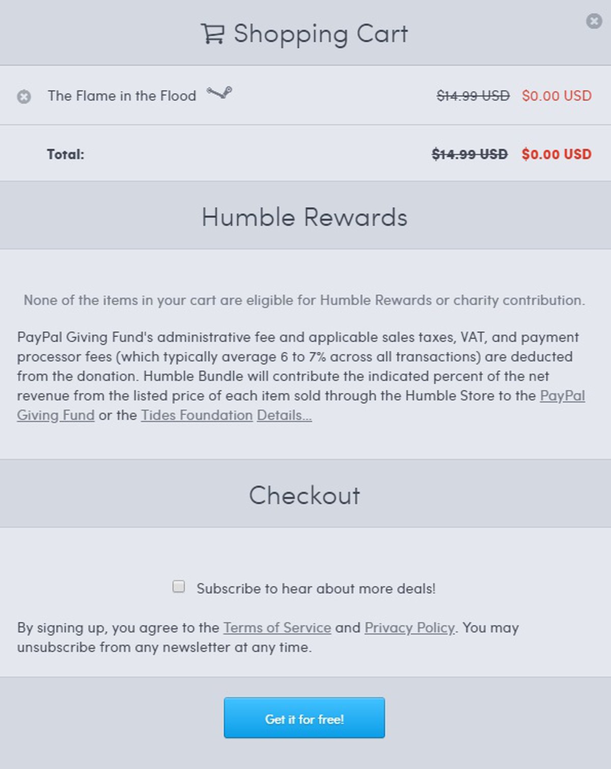 Чтобы получить ключ активации для Steam вам следует открыть страницу The Flame in the Flood в Humble Bundle и добавить игру в корзину. После этого перейдите в саму корзину — вы увидите что-то такое: