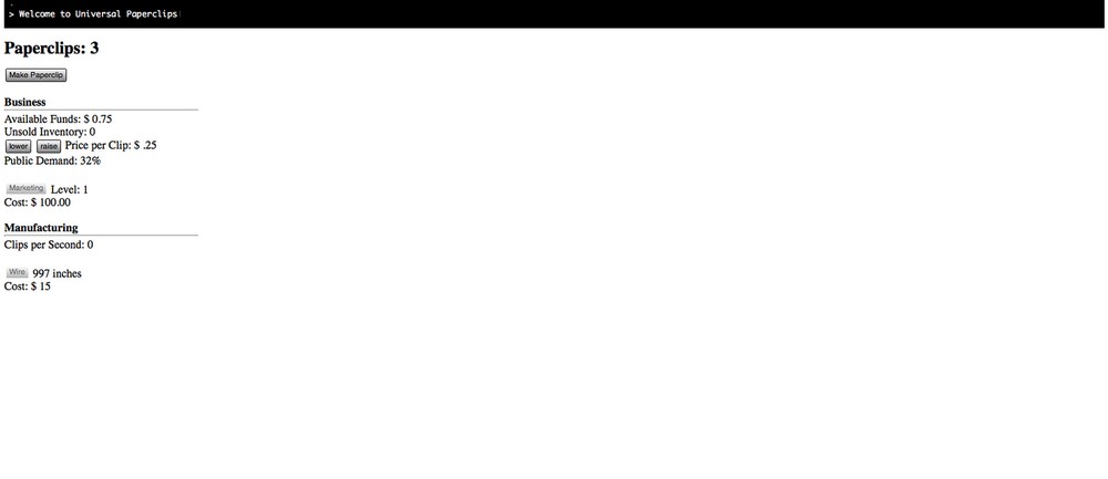 На фоне всех книг и фильмов, близко подобраться к гипотетической правде удалось игре Universal Paperclips. В этом проекте, разработанном Фрэнком Лэнтзем (который вдохновился мысленным экспериментом Ника Бострома), мы можем сыграть за искусственный интеллект, задача которого - делать скрепки. Вы нажимаете кнопку - получается скрепка. Нажимаете ещё раз - другая. Щёлк, щёлк, щёлк, и чем дальше вы заходите, тем больше надо щёлкать.