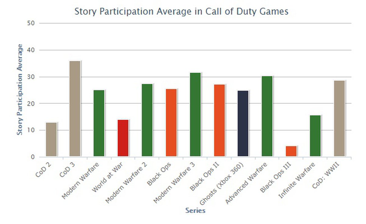 Для определения активности игроков в сюжетных кампаниях Call of Duty издание проанализировало полученные достижения всех игр серии начиная с Call of Duty 2. Журналисты пришли к выводу, что сюжетный аспект Call of Duty пользуется не слишком большой популярностью.