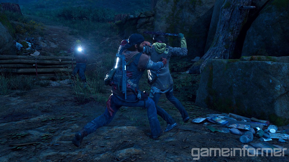 Еще одно развлечение, показанное в геймплейных роликах. В мире Days Gone опасность представляют не только инфицированные: далеко не все выжившие люди предпочитают жить в крупных лагерях и подчиняться некоему подобию законов. В лесах и на дорогах время от времени встречаются негодяи, готовые лишить выживших последнего имущества.