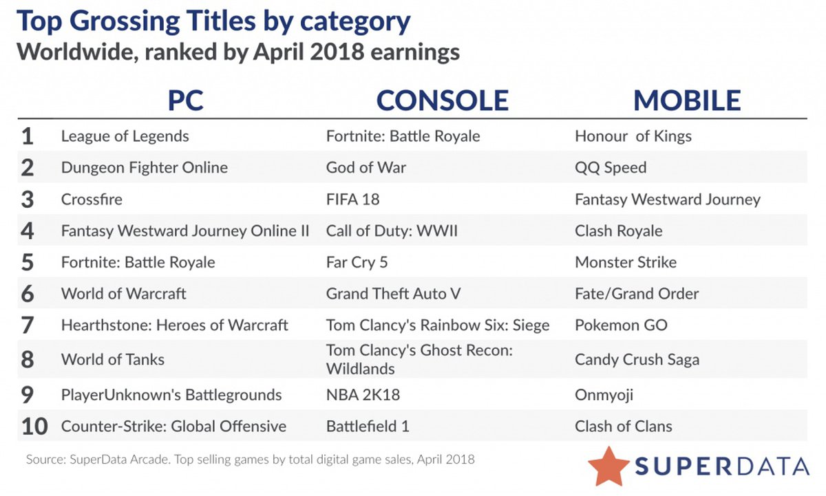 Выручка конкурента Fortnite, PlayerUnknown’s Battlegrounds, в отчете SuperData не упоминается. Сама игра появляется в отчете всего раз: в апреле выручки PUBG хватило, чтобы подняться на 9 строчку топа самых прибыльных игр для PC.