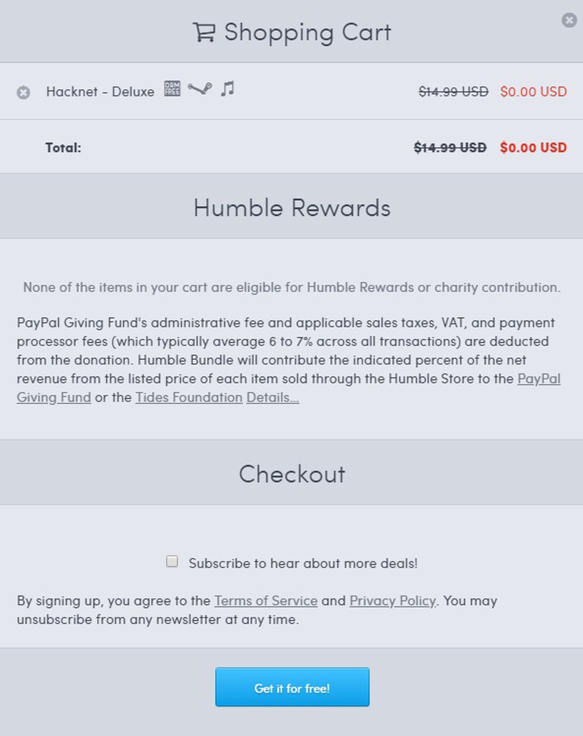 Чтобы получить ключ Hacknet Deluxe для Steam нужно пройти несколько шагов. Для начала отправляйтесь на страницу игры в Humble Bundle и добавьте Hacknet в корзину. Теперь откройте ее: перед вами появится примерно такое окно.