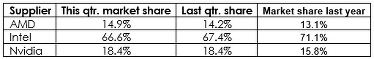 Доли ключевых игроков рынка практически не изменились. Nvidia контролирует 18.4% рынка GPU, благодаря майнерам доля AMD выросла с 14.2% до 14.9%. Основная доля у Intel: благодаря интегрированной графике компания контролирует 66.6% рынка.