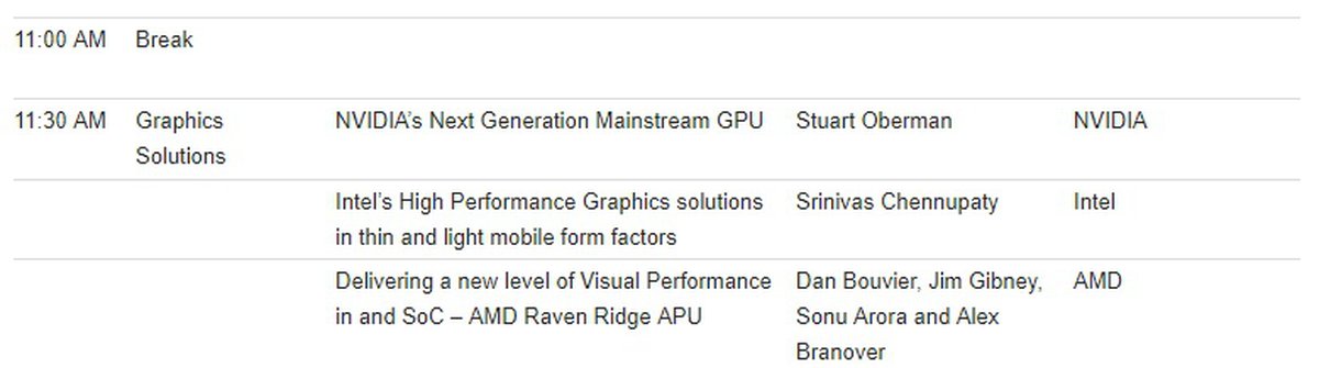 Презентация нового массового решения Nvidia может состояться до конца лета. Ресурс VideoCardz обратил внимание на августовскую конференцию Hot Chips: одним из спикеров будет Стюарт Оберман из Nvidia. Судя по расписанию конференции, Стюарт расскажет о следующем поколении графических чипов компании.