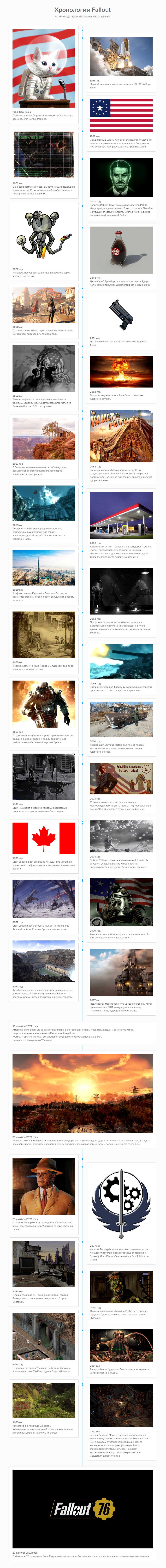 Мы вспомнили о самых важных событиях, предшествовавших открытию дверей Убежища 76. До конца Второй мировой войны вселенная Fallout не отличается от нашей, первые различия появляются в пятидесятых годах двадцатого века.