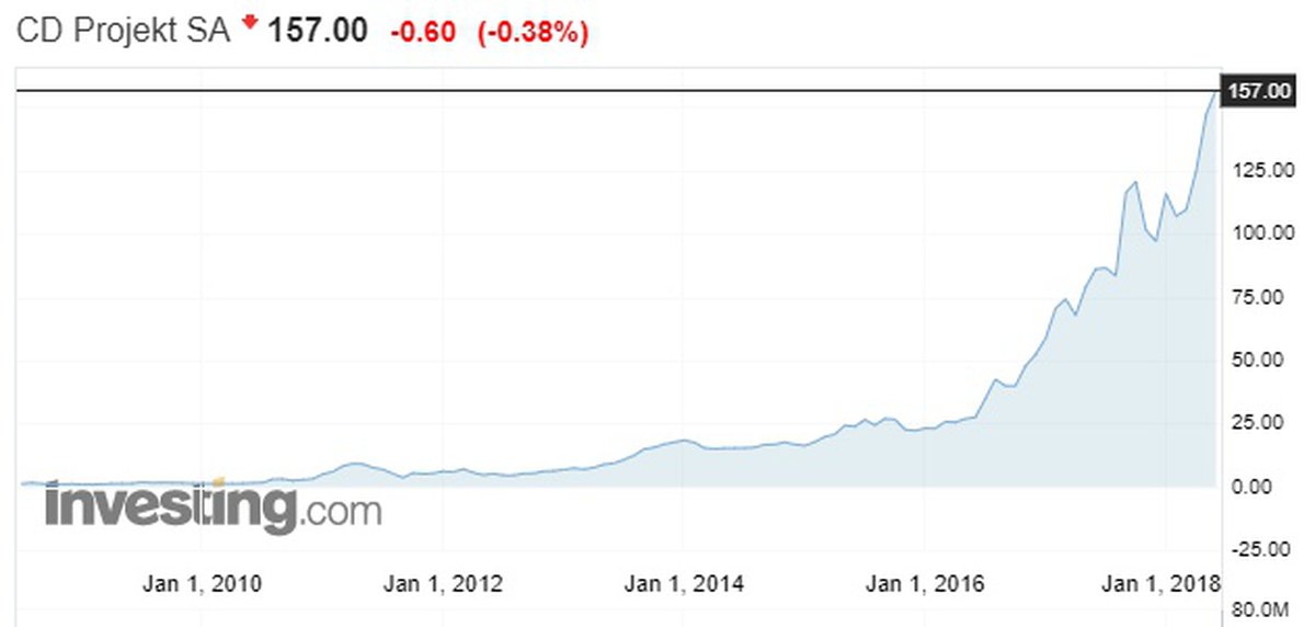Всего год назад капитализация компании была почти в два раза меньше. В июне 2017 года за акцию CD Projekt давали чуть больше 80 злотых, стоимость холдинга оценивалась приблизительно в 2 миллиарда долларов. В сентябре того же года цена акций выросла на 50%, капитализация достигла 3 миллиардов долларов.