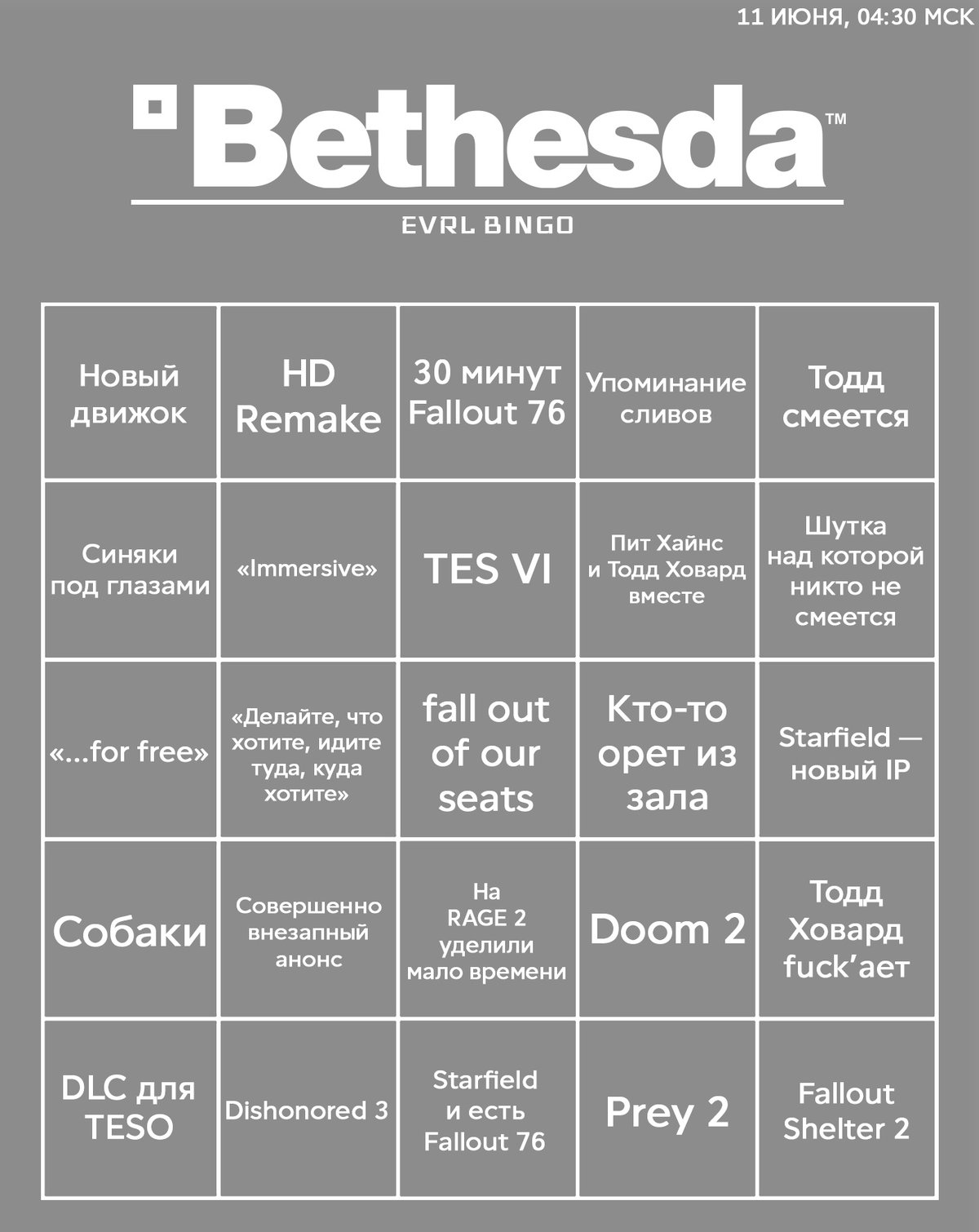 Карточки E3-бинго — отличный способ не вырубиться в самый разгар утренних конференций Bethesda Softworks и игрового подразделения Sony.
