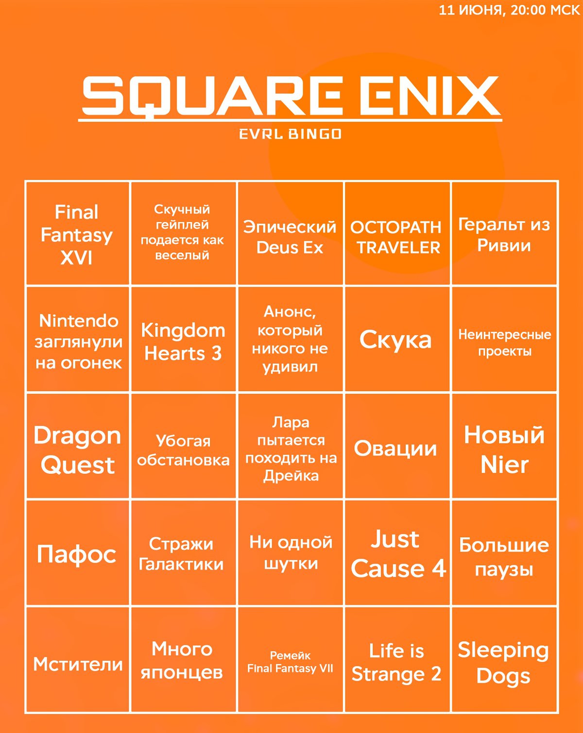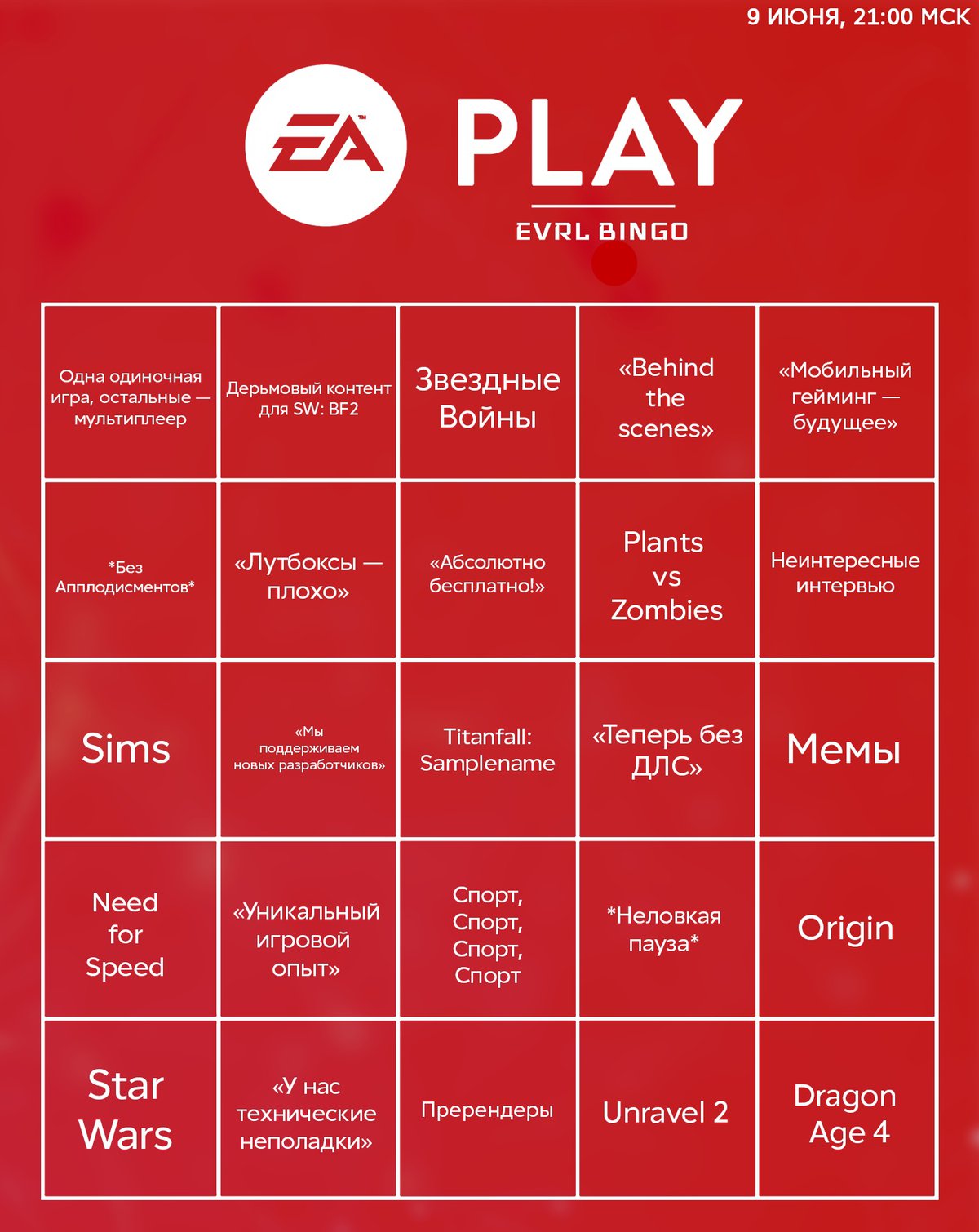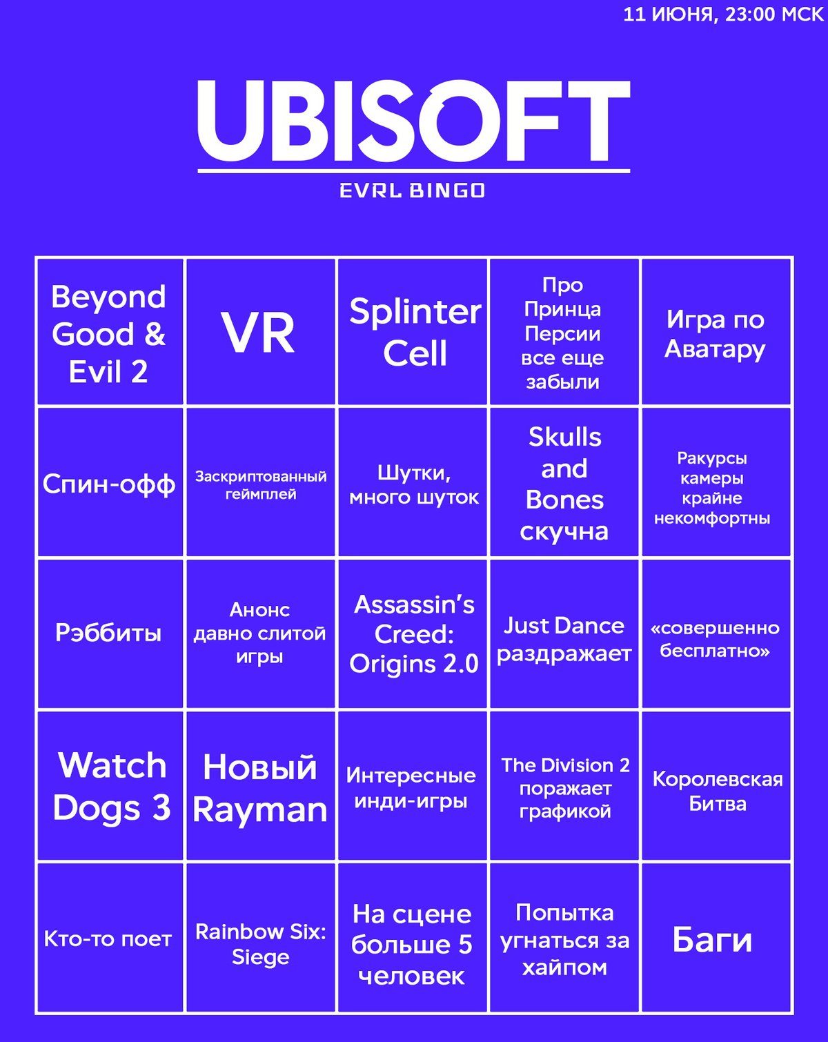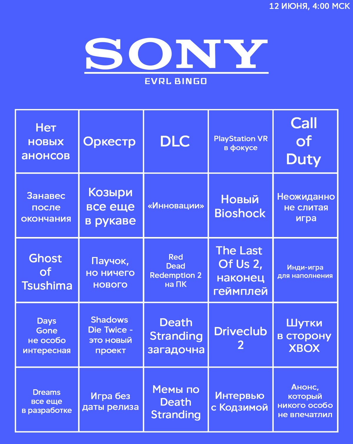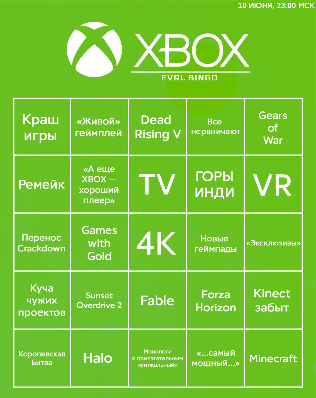 На помощь приходят карточки E3-бинго, любезно составленные мистером DoKKeL. Правила просты: смотрите конференции, отмечайте прозвучавшие слова и произошедшие события. Собрали целый ряд по вертикали, горизонтали или диагонали — победа!
