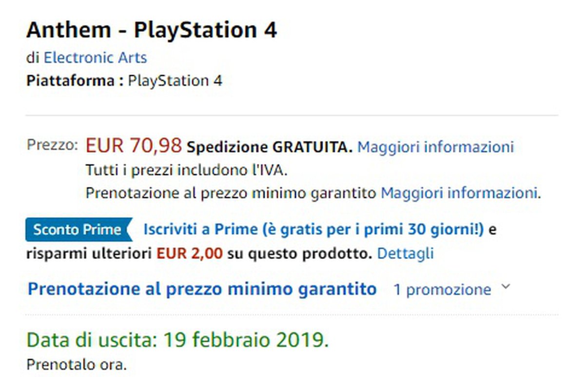 Всего за час до начала EA Play итальянская версия интернет-магазина Amazon украла у Electronic Arts один из анонсов. Магазин назвал дату выхода Anthem, новой игры BioWare: 19 февраля 2019 года. Выглядит реалистично — игра должна выйти до 31 марта, последнего дня финансового года EA.