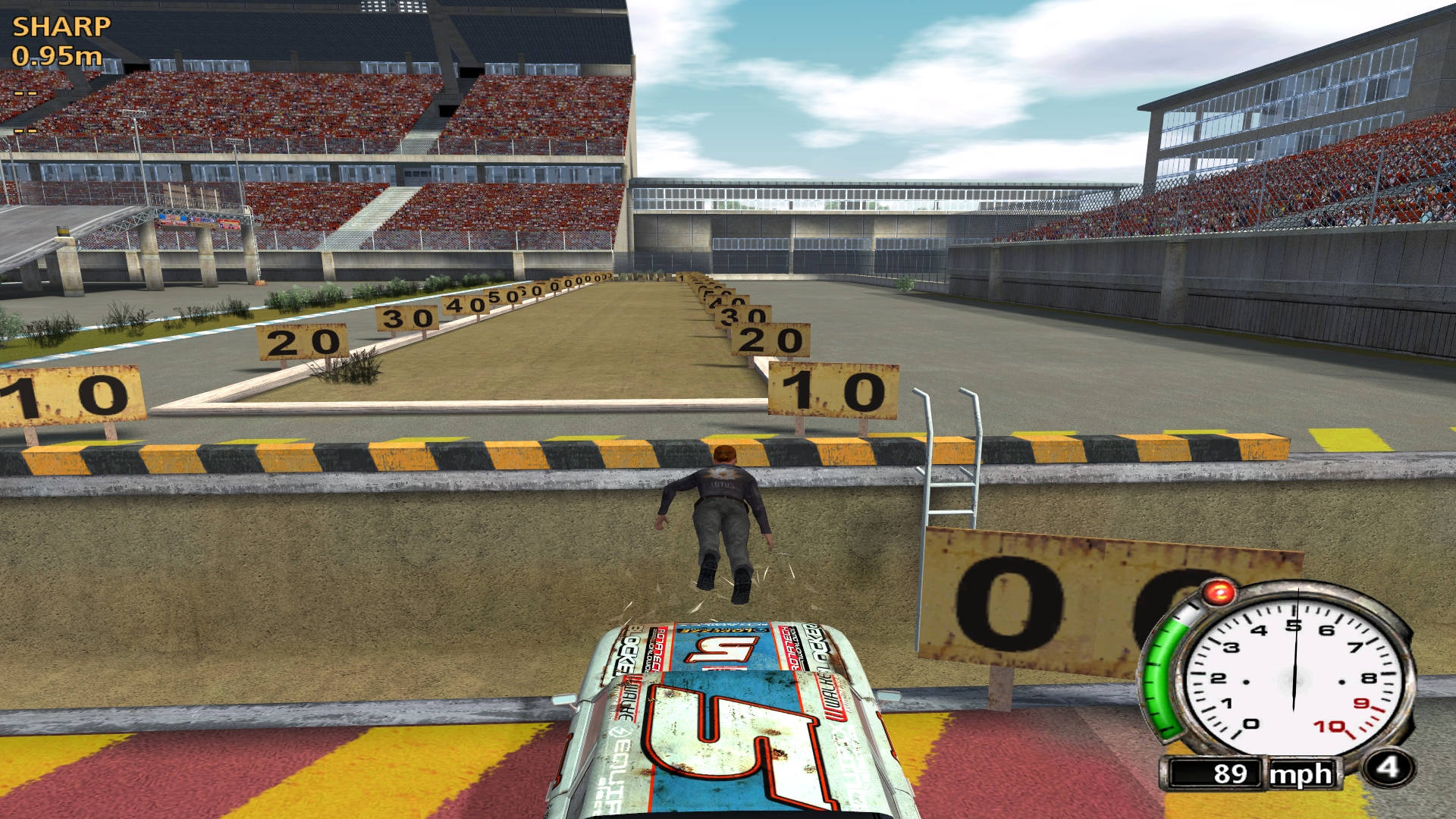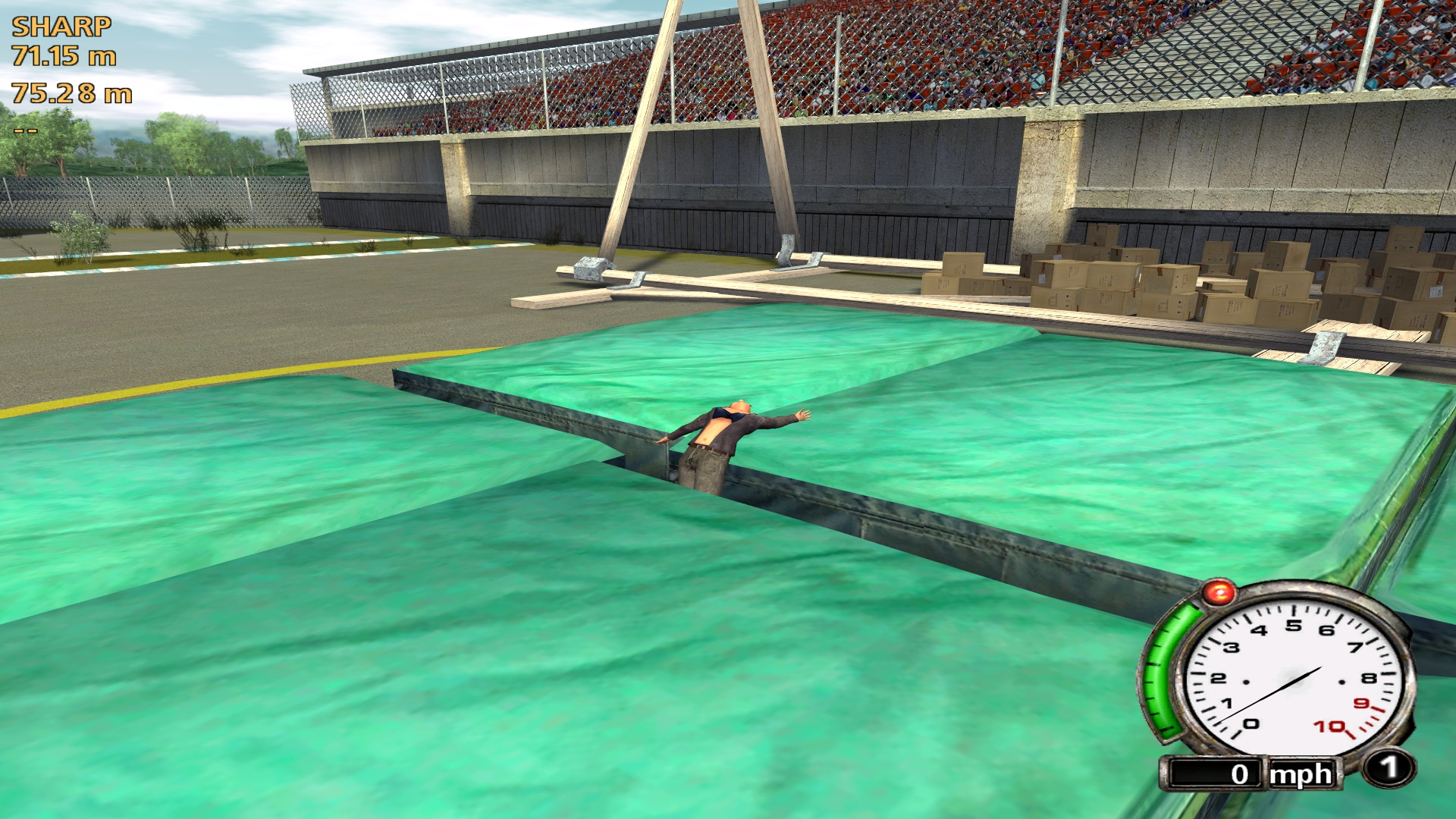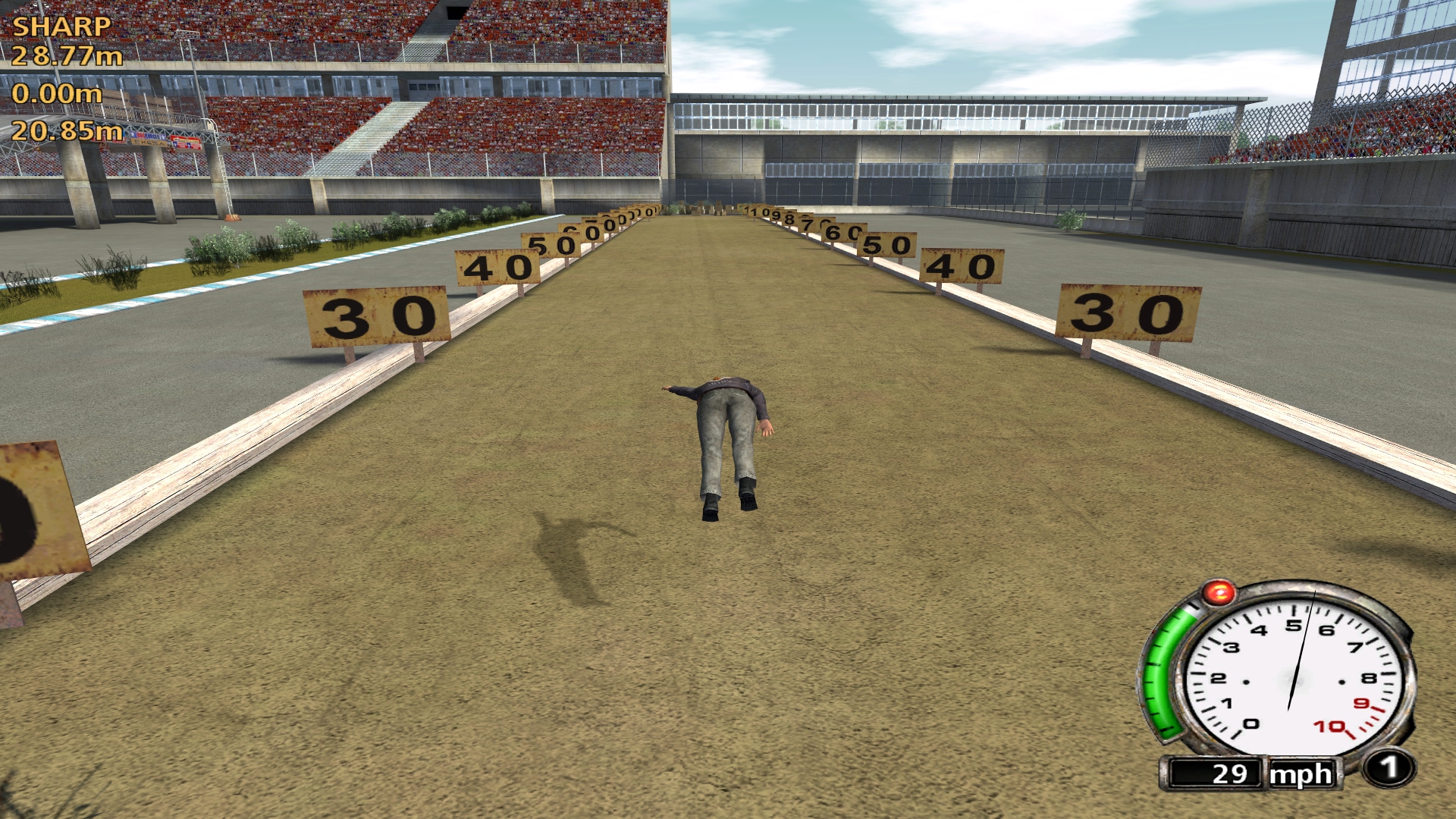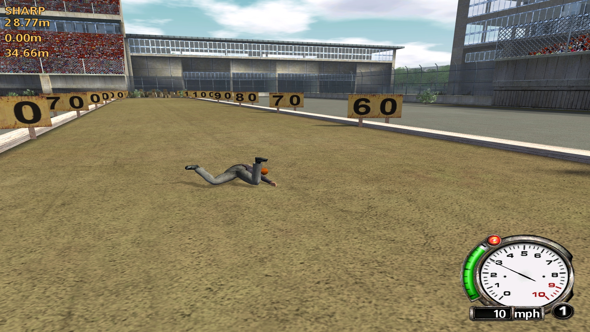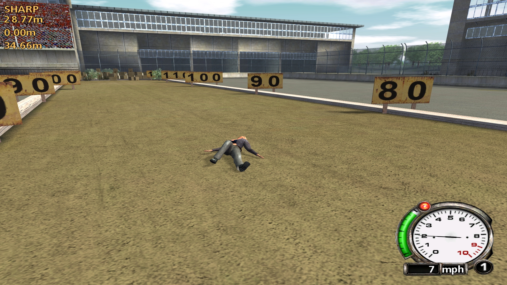Суть этой мини-игры - разогнаться по прямой линии и, зажав ctrl, запустить нашего водителя, через лобовое стекло, как можно дальше. Как только персонаж коснулся земли, дальность полета останавливается, и как бы далеко вы дальше не катились на пузе - не важно. Чем дальше водитель летит, тем лучше.