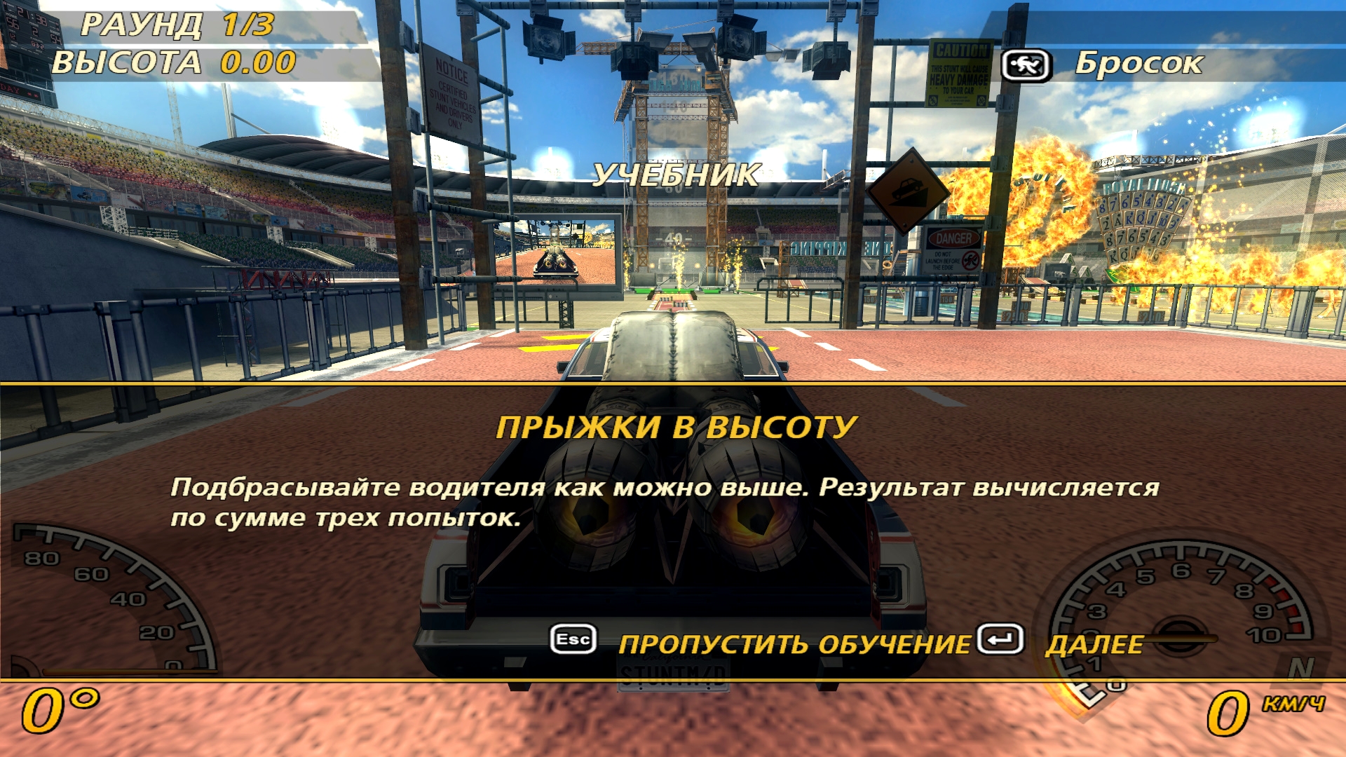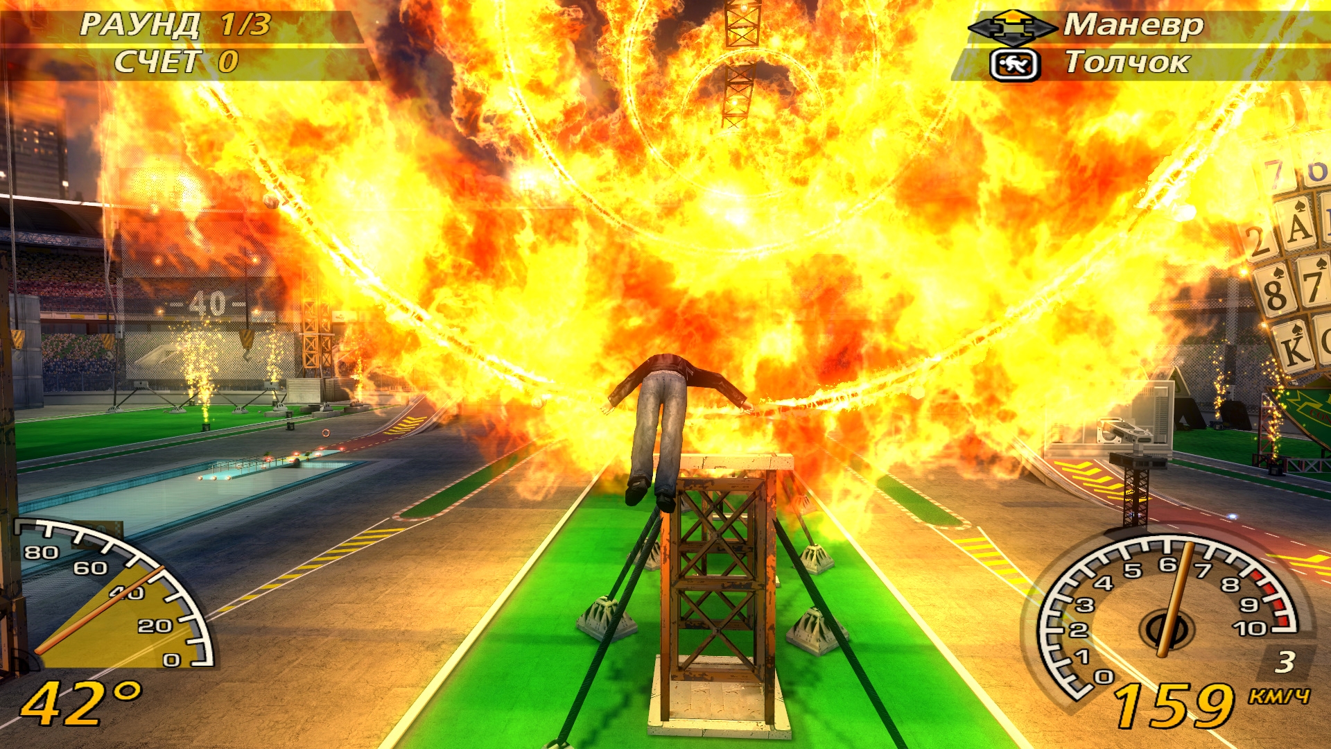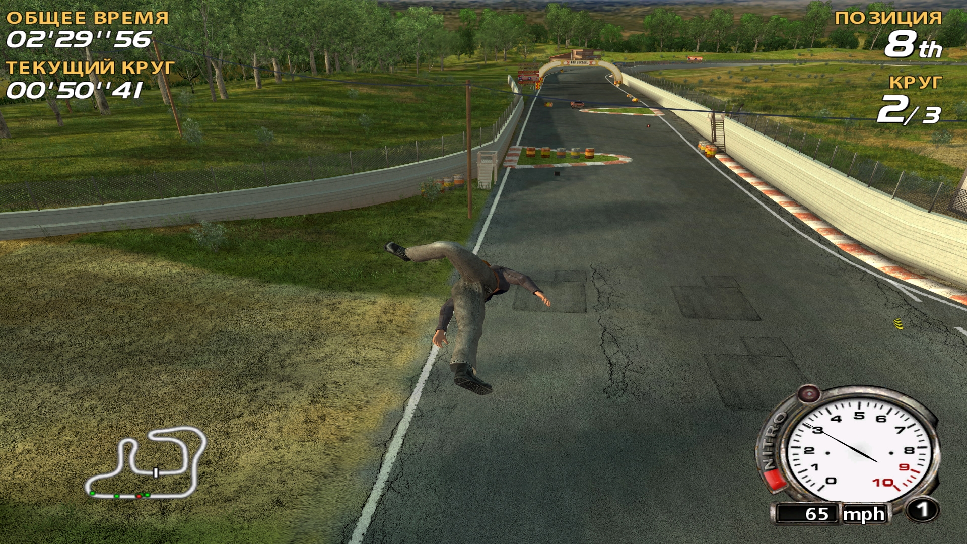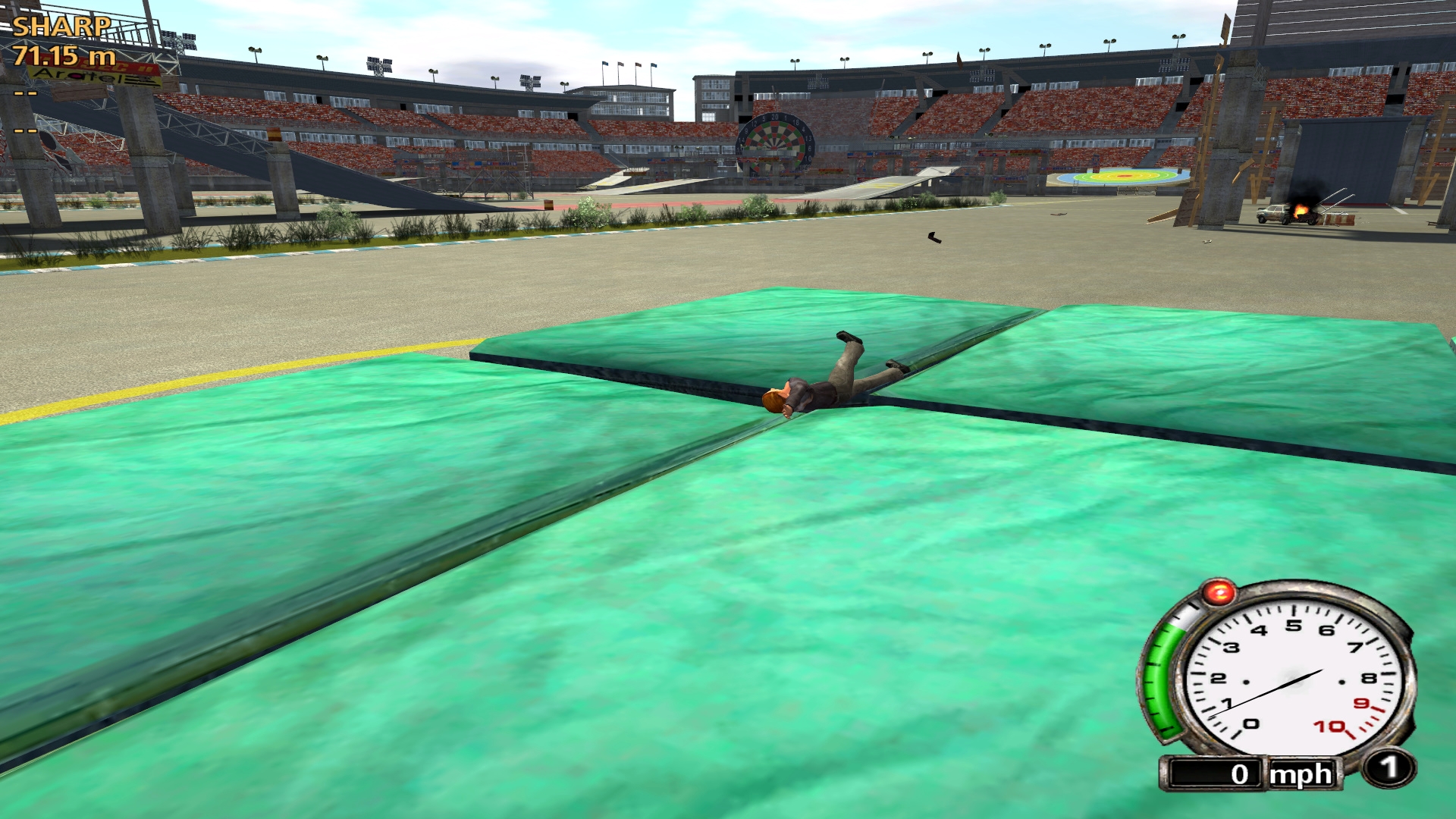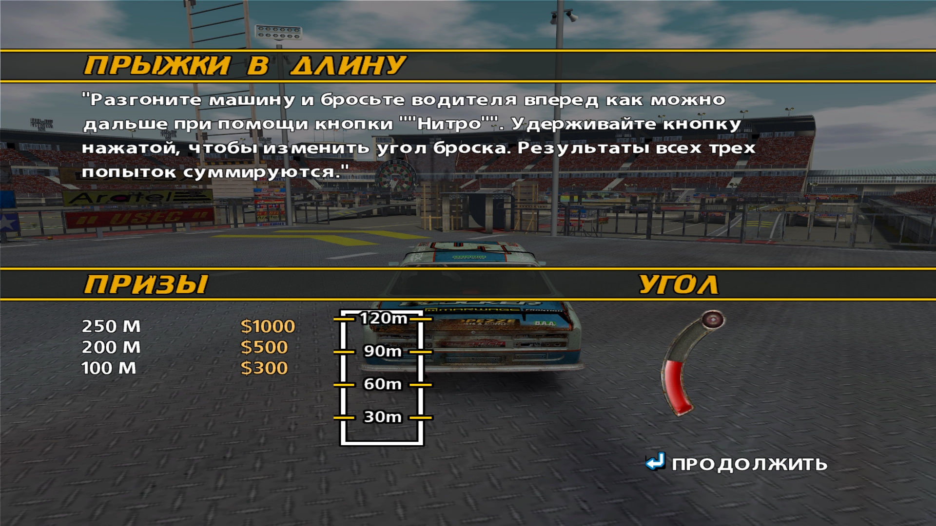 Суть этой мини-игры - разогнаться по прямой линии и, зажав ctrl, запустить нашего водителя, через лобовое стекло, как можно дальше. Как только персонаж коснулся земли, дальность полета останавливается, и как бы далеко вы дальше не катились на пузе - не важно. Чем дальше водитель летит, тем лучше.