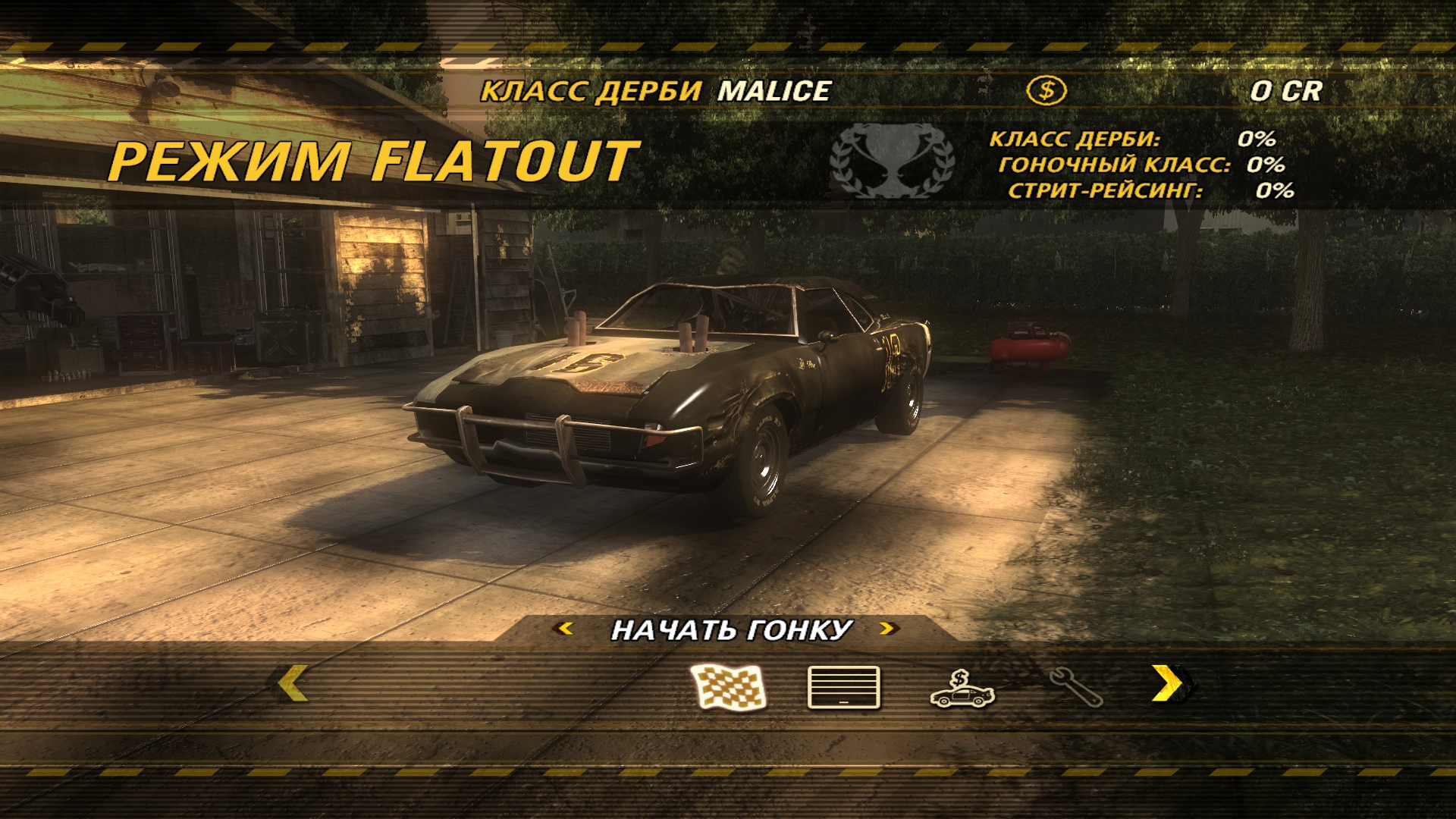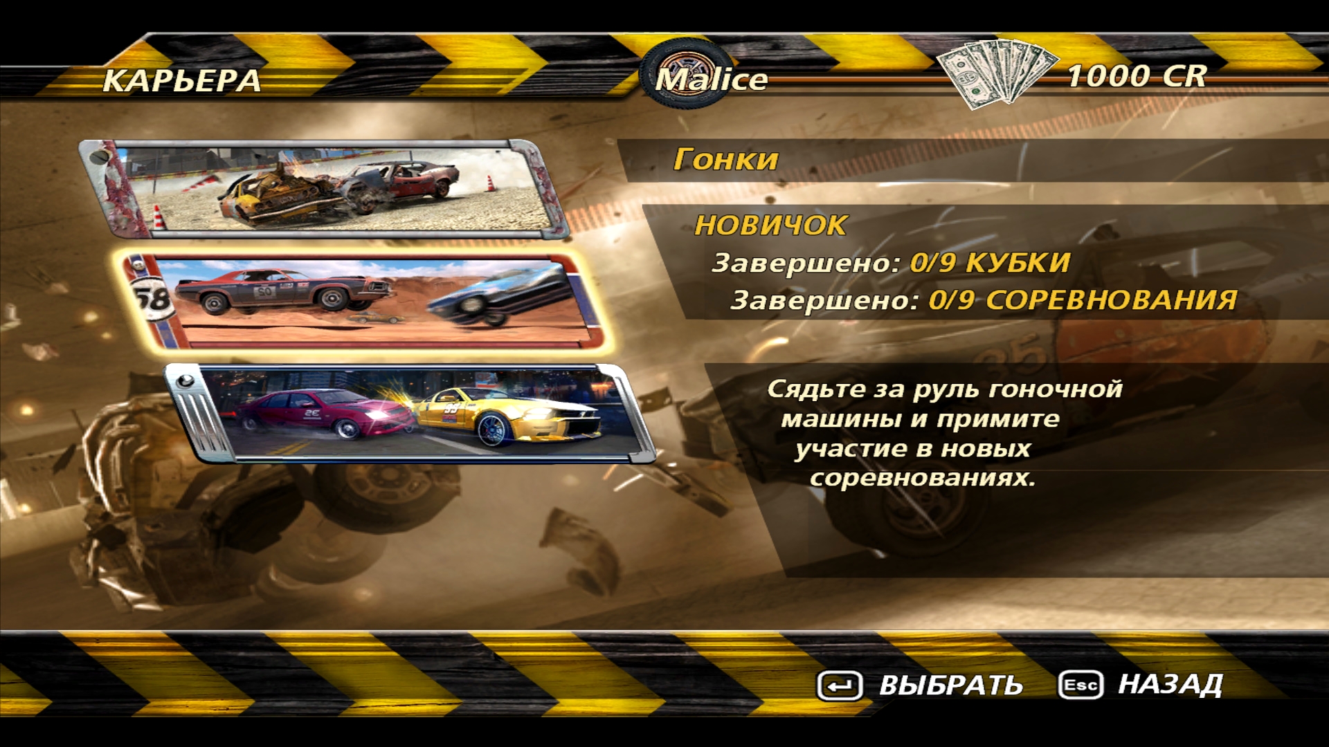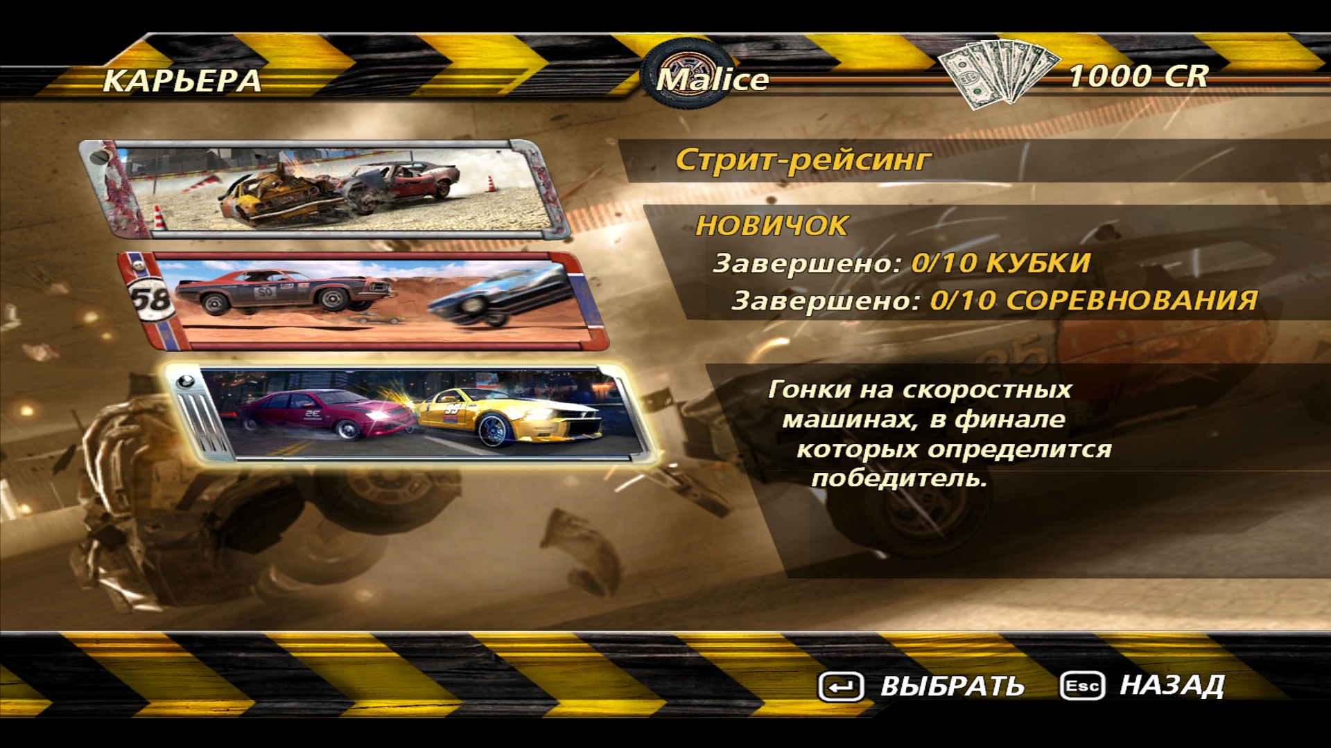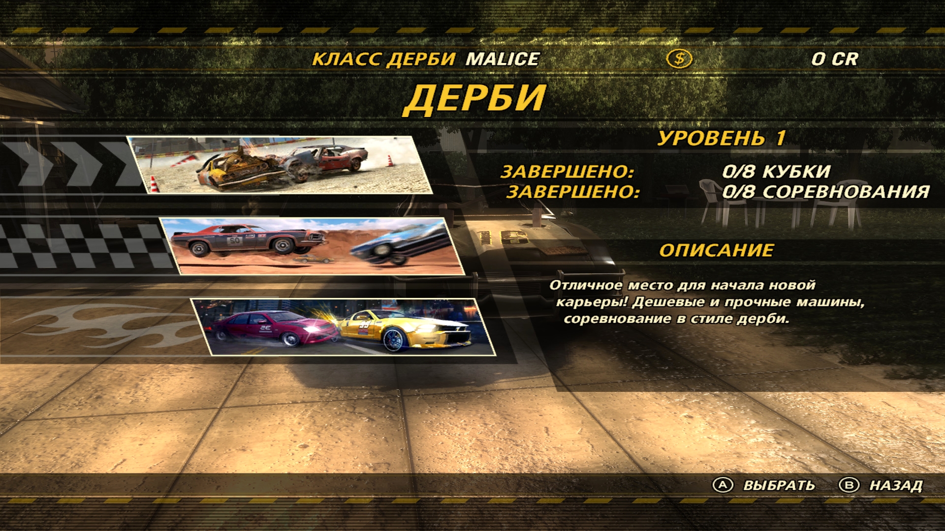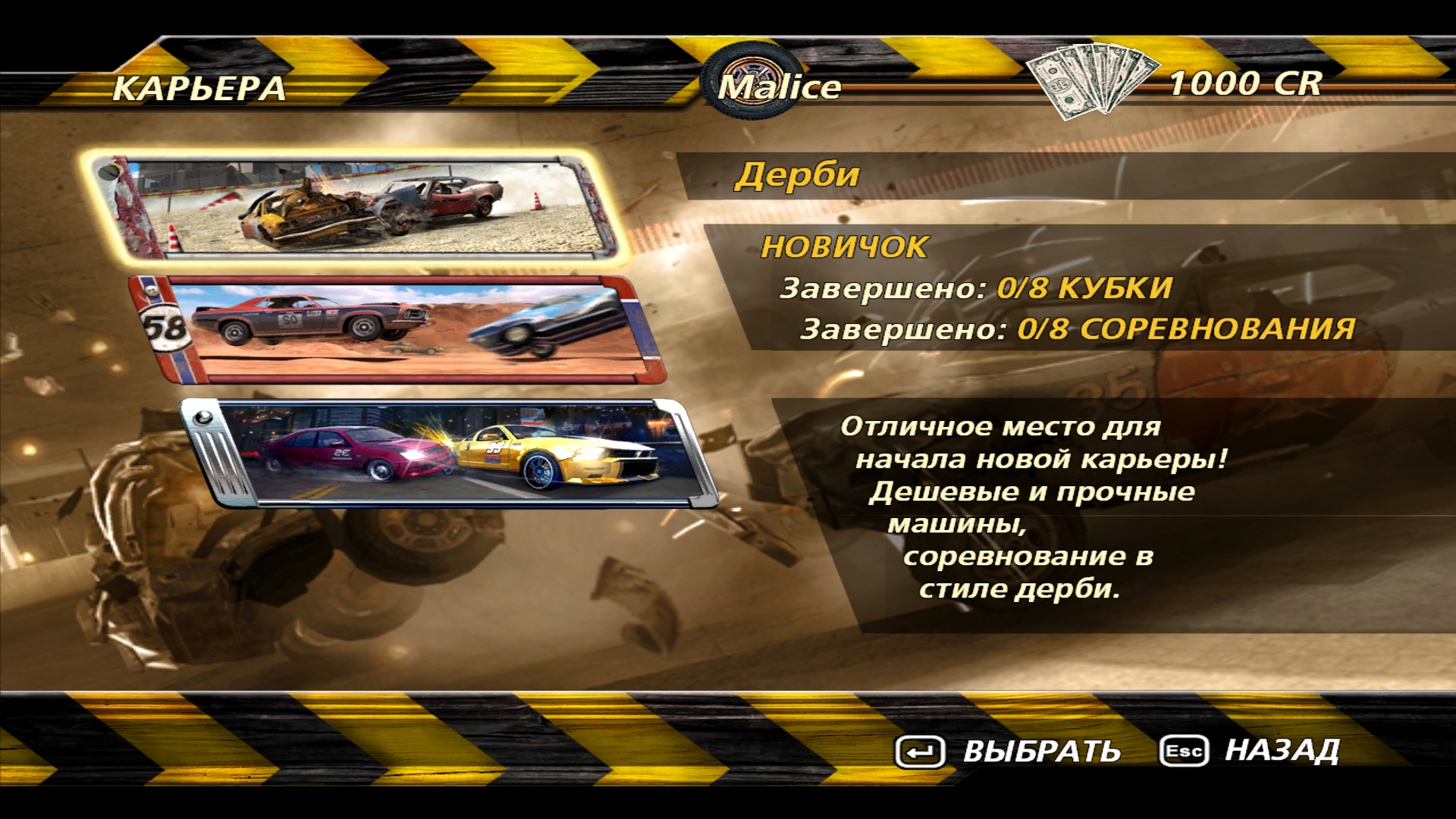 Давайте кратко рассмотрим режимы данной игрушки. Первым делом посмотрим на то, что есть в карьере. В карьере три вида гонок - дерби, соревнования на старых и ржавых корытах, гонки - соревнования на неплохих спортивных машинах, ну и стрит-рейсинг, гонки на современных красивых и блестящих машинках. Как я уже сказал выше - за победы в режиме карьеры вам будут открываться новые трассы и автомобили.