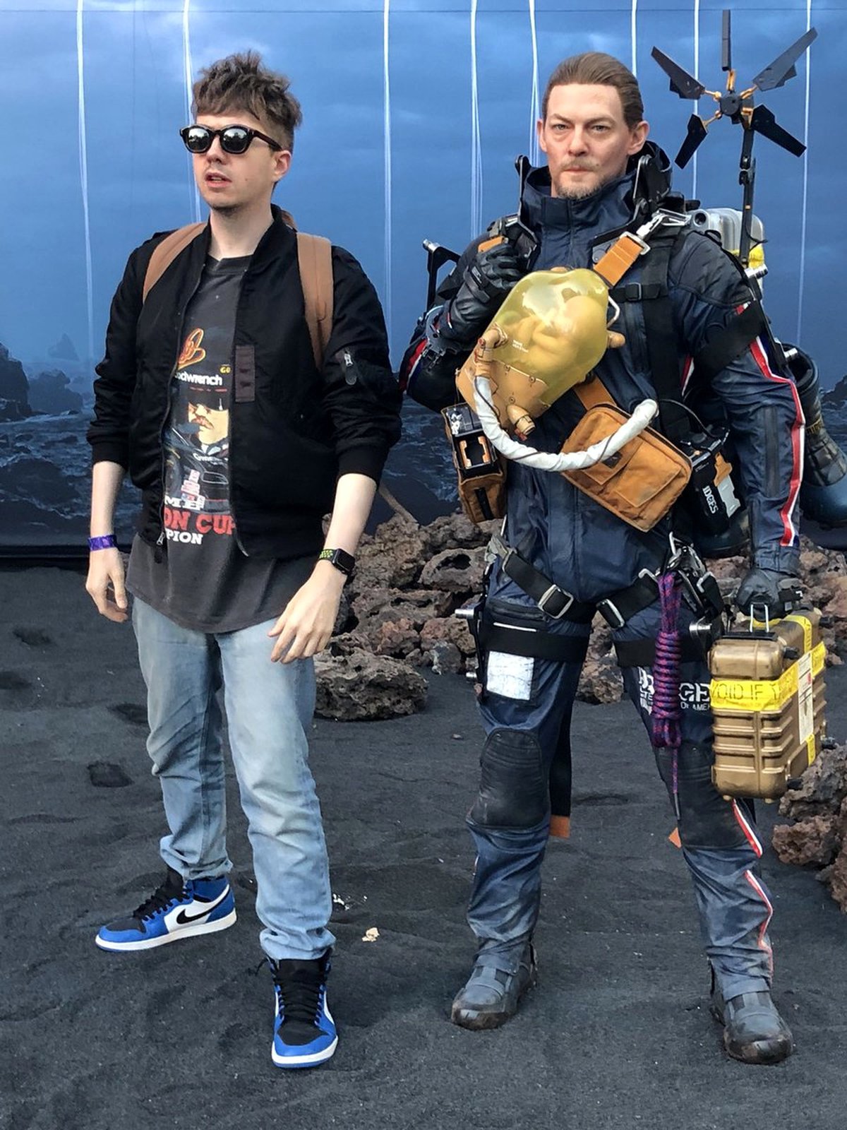 Хидео Кодзима привез на E3 статую героя Death Stranding и примерил ее снаряжение