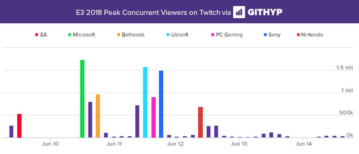 Пресс-конференцию Ubisoft смотрели 1.6 миллионов человек (в 2017 году их было 986 тысяч), за шоу Sony в прямом эфире следило полтора миллиона зрителей (926 тысяч годом ранее). Очень сильно выросла Bethesda: на этот раз компания собрала 964 тысячи зрителей, на 731 тысячу больше, чем в прошлом году.