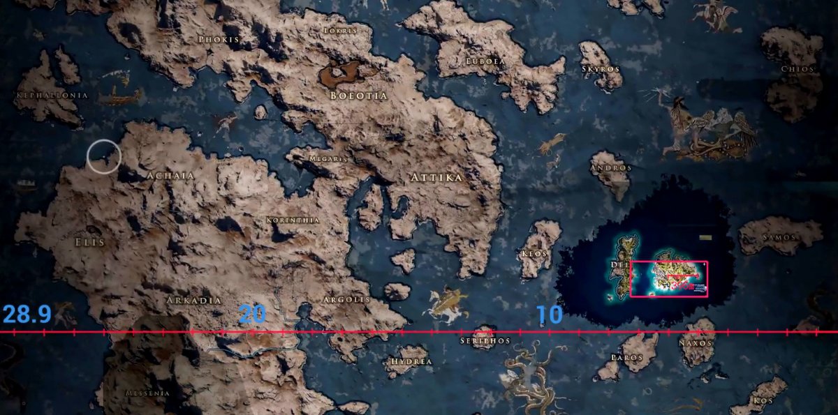 Благодаря множеству геймплейных видео появилась возможность довольно точно вычислить площадь игрового мира. В одном из роликов главный герой Odyssey стоит на террасе с выбранной точкой интереса, находящейся относительно неподалеку. И позиция игрока, и точка интереса легко находятся на карте.