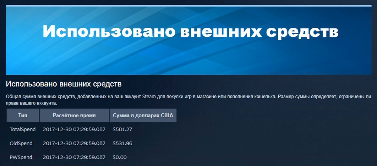 Взглянуть на эти цифры можно в разделе External Funds Used или, в русской локализации, «Использовано внешних средств». Описание страницы звучит так: «Общая сумма внешних средств, добавленных на ваш аккаунт Steam для покупки игр в магазине или пополнения кошелька. Размер суммы определяет, ограничены ли права вашего аккаунта».