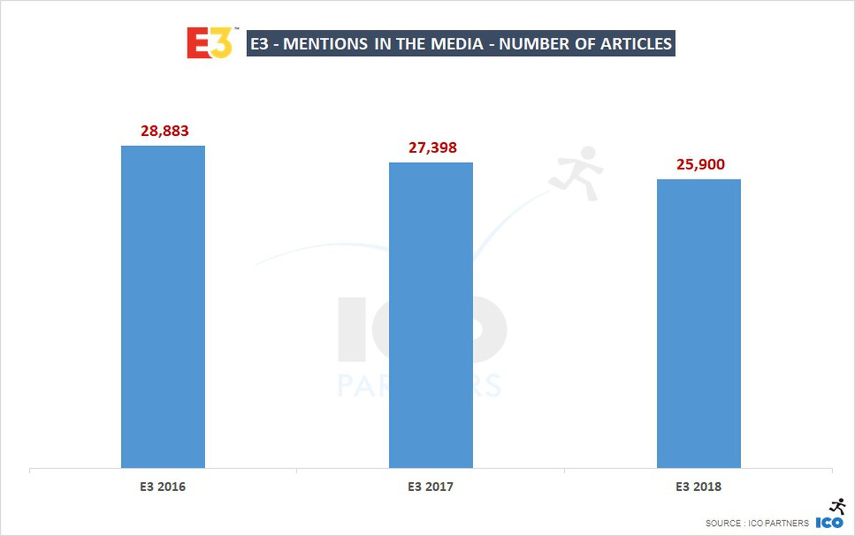 В ICO Partners отмечают, что масштабы освещения выставки E3 снижаются второй год подряд. В 2016 году о выставке было написано 28883 статьи, в 2017 году их было уже 27398, сейчас — только 25900.