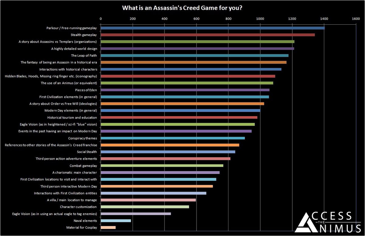 Вот так, в порядке от наиболее важного к наименее важному, выглядят главные элементы Assassin's Creed по результатам опроса Access The Animus: