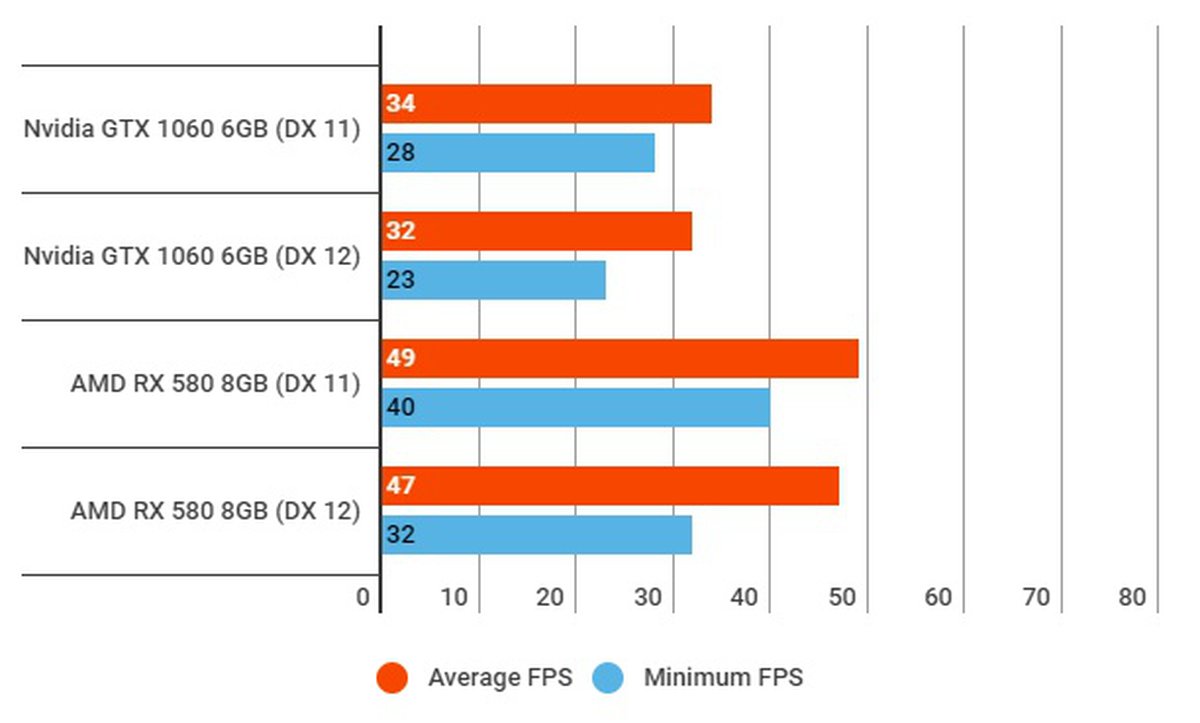 С повышением разрешения до 1440p ситуация не изменилась: видеокарта AMD по-прежнему показывала более высокую среднюю частоту кадров и меньшие просадки. Заодно журналисты выяснили, что к работе с DirectX 12 игра пока не готова — переключение на новую версию API в большинстве случаев приводило к падению частоты кадров.