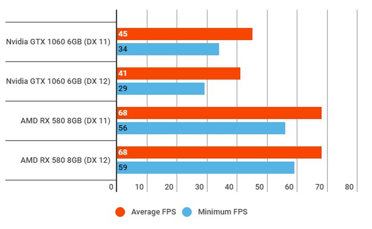 Издание проверило работу альфа-версии Battlefield V на PC с AMD Ryzen 7 2700X и 16 гигабайтами памяти DDR4, используя две конкурирующих видеокарты: Nvidia GeForce GTX 1060 с 6 гигабайтами памяти и AMD Radeon RX 580 с 8 гигабайтами памяти. Обычно карты выдают близкую производительность, но в Battlefield V все было иначе.