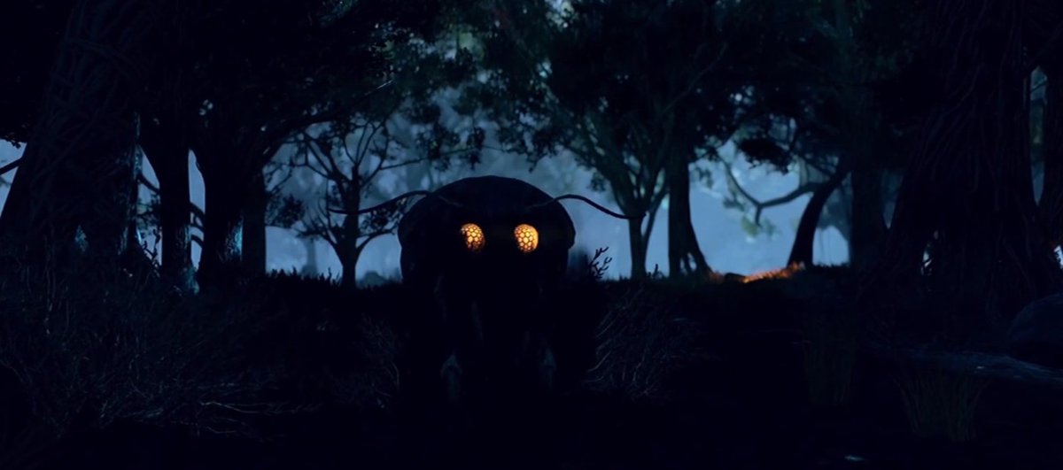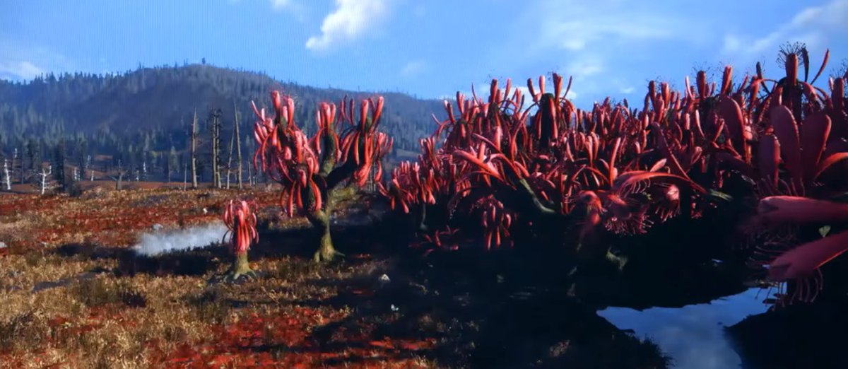 Необычные, бордово-красного цвета растения, напоминающие высокие кусты с толстыми стеблями и странными соцветиями. О растениях мы не знаем почти ничего, но они, похоже, хищники: на концепт-артах рядом можно заметить кости.