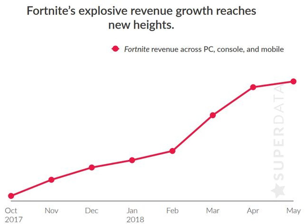Согласно данным SuperData, с октября 2017 года (бесплатная Fortnite Battle Royale вышла в конце сентября) по май 2018 года выручка Fortnite непрерывно росла. Пик пришелся на март и апрель, в мае прирост выручки замедлился.