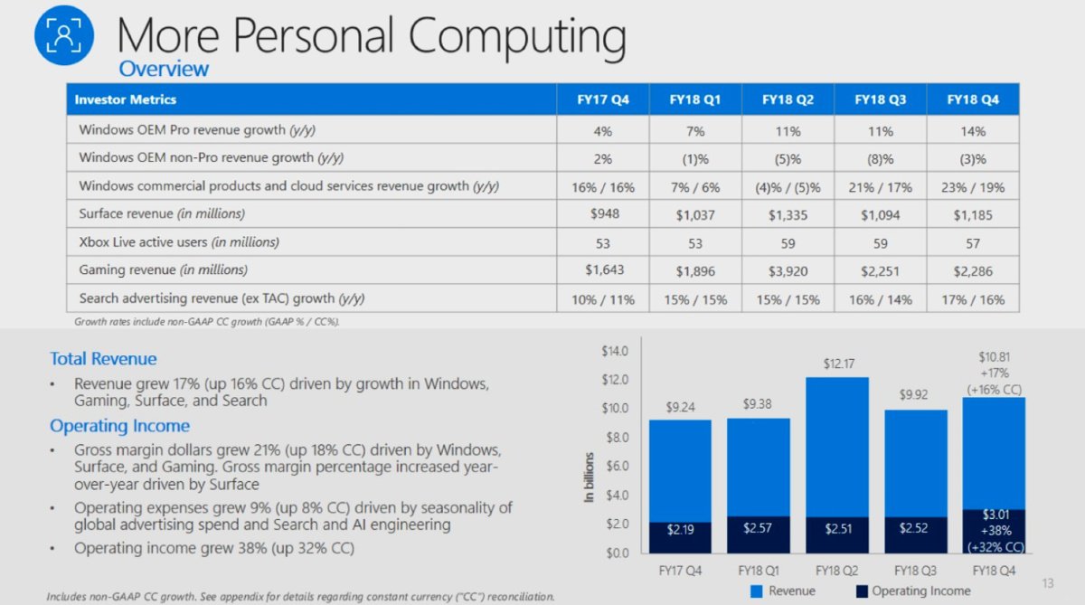Корпорация Microsoft опубликовала отчет за четвертый квартал 2018 финансового года, закончившийся 30 июня 2018 календарного года. Общая выручка Microsoft выросла на 17% и достигла $30.1 миллиарда. Операционная прибыль компании увеличилась на 35%, до $10.4 миллиардов, чистая прибыль составила $8.9 миллиардов.