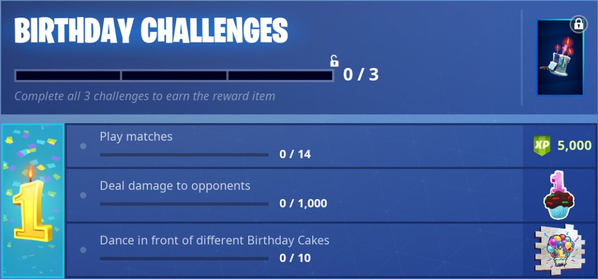 Всего праздничных наград будет несколько. За нанесение 1000 единиц урона выдается эмоция «День рождения Fortnite», танец перед десятком именинных тортов разблокирует граффити «С днём рождения!», а после участия в 14 матчах игрок получит 5000 опыта.