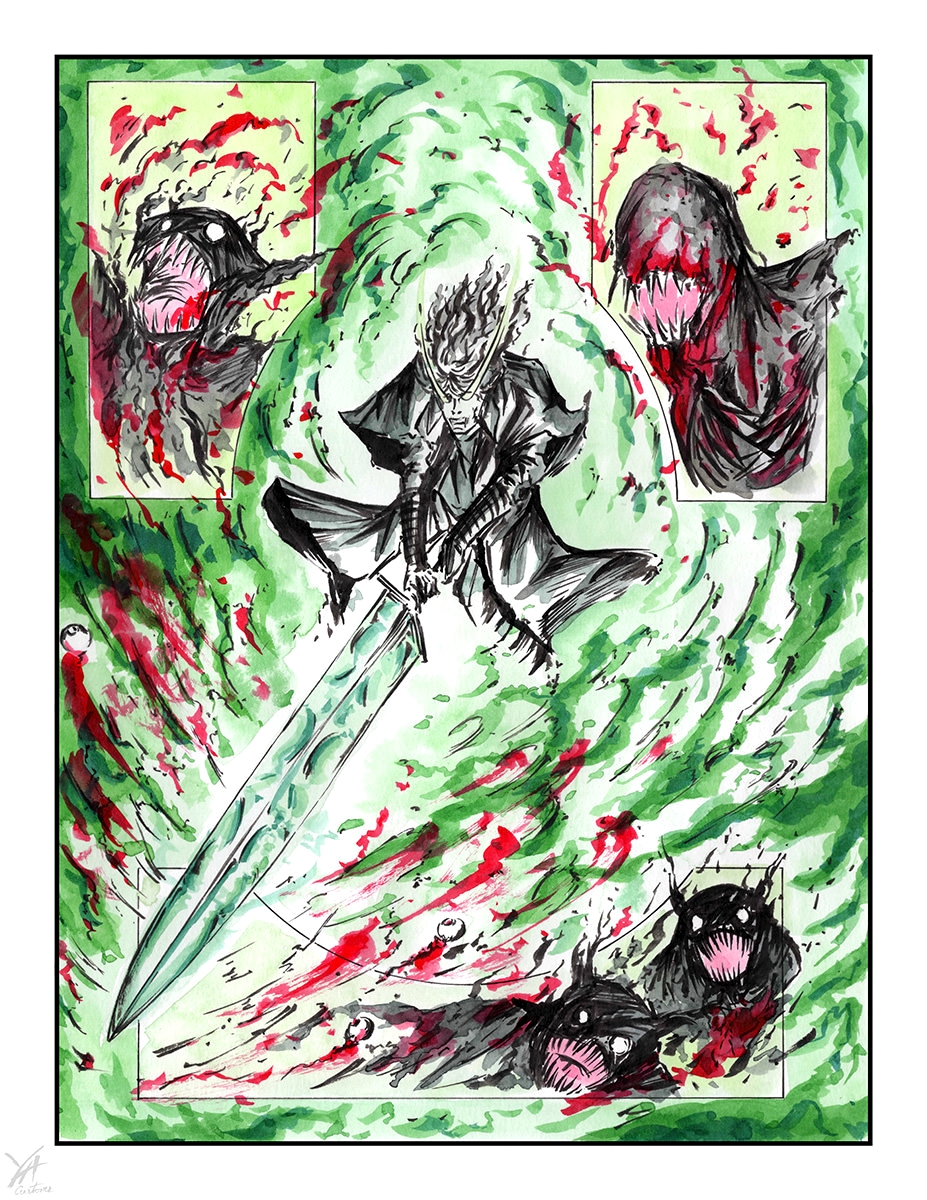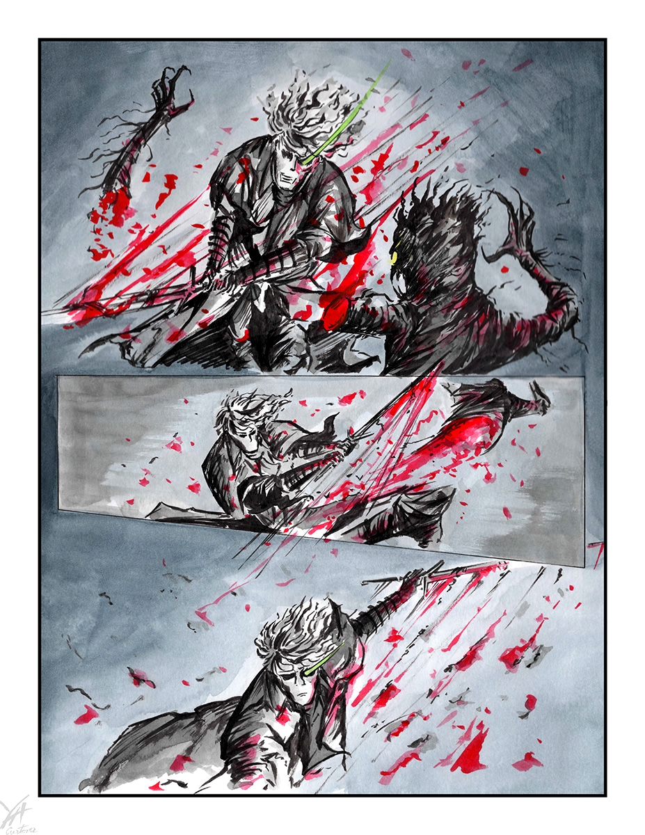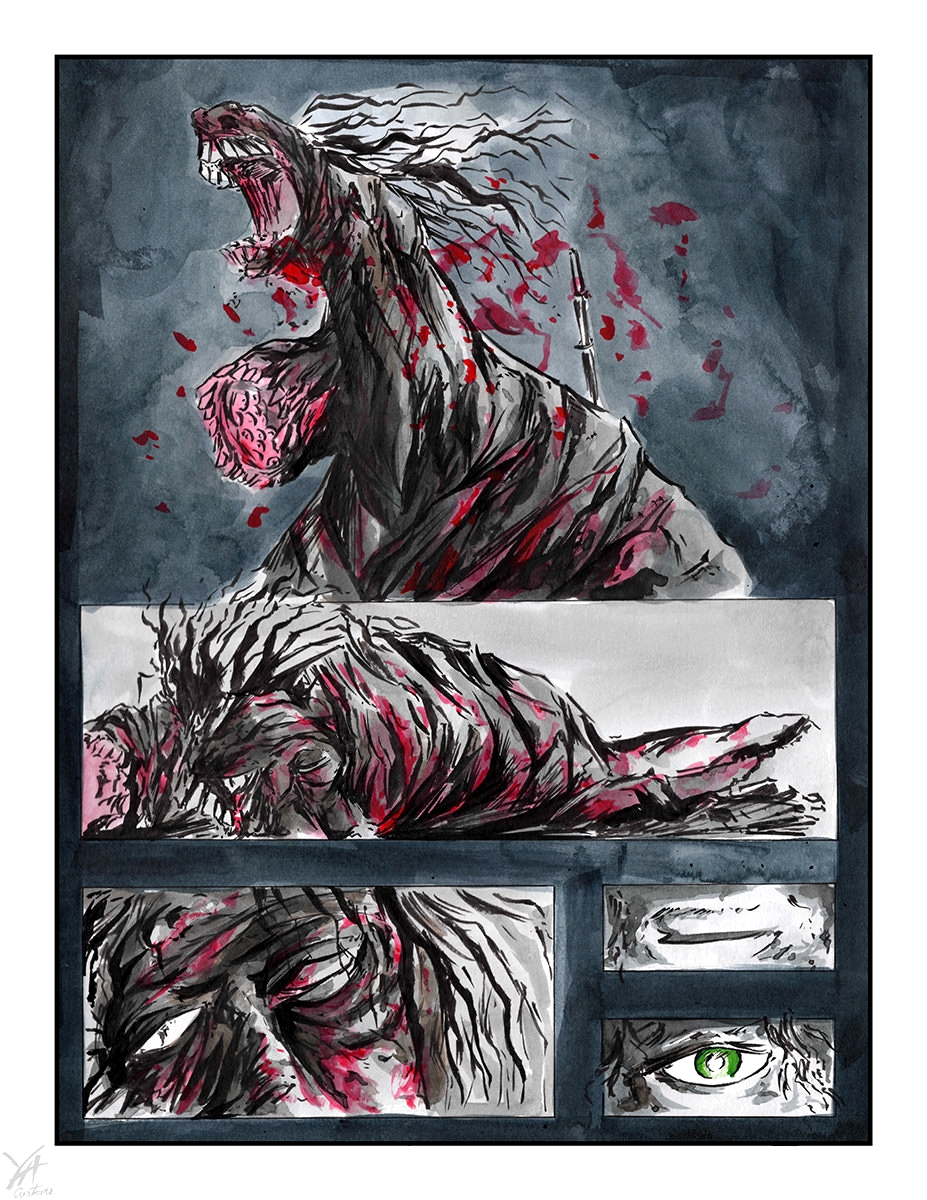 История первого охотника Церкви исцеления и его превращения в кошмарное чудовище уложилась в десять эмоциональных рисунков.