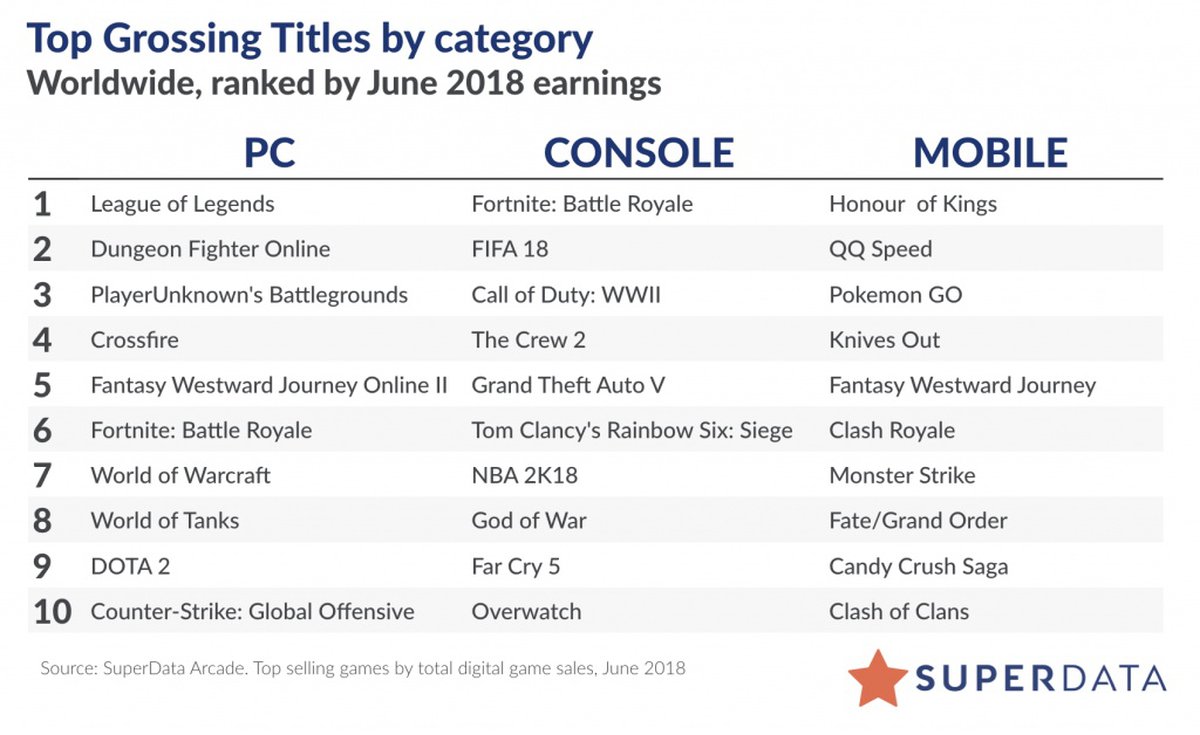 Списки самых прибыльных игр для PC и консолей продолжают возглавлять League of Legends и Fortnite Battle Royale соответственно. PUBG занимает 3 место в топе игр для PC (Fortnite BR здесь на 6 месте), в топ консольных игр проект не попал.