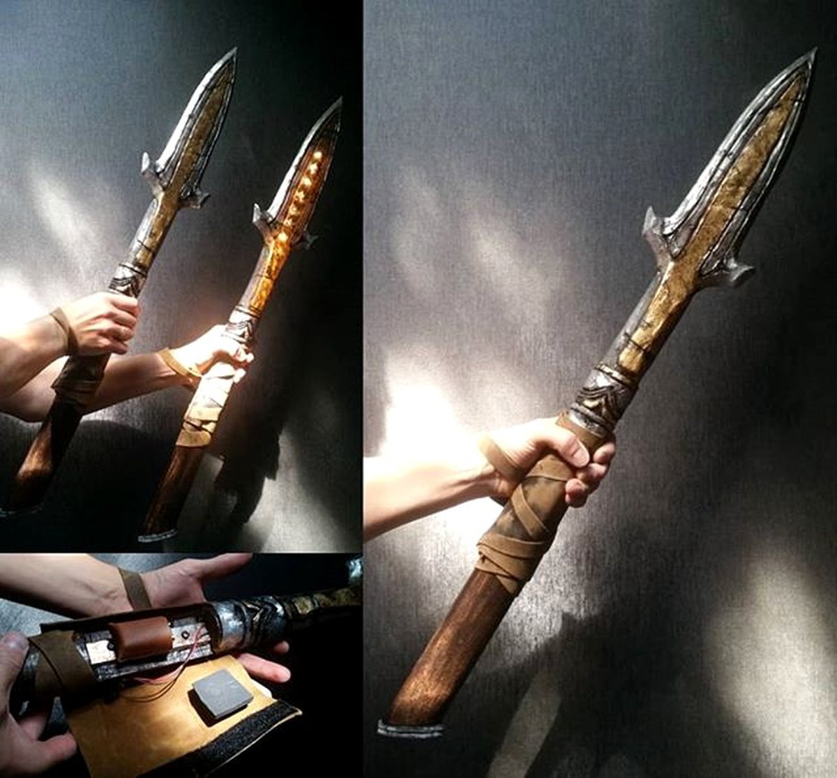Финальная версия копья обросла множеством деталей, свечение можно включать и выключать. На следующей фотографии Рик показывает два копья, одно во включенном, а другое в выключенном состоянии.