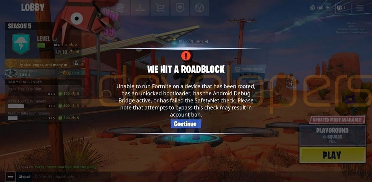 В xdadevelopers выяснили, что Epic стремятся запретить работу Fortnite на устройствах с рут-правами. В некоторых случаях разработчикам это удается: при попытке запуска Fortnite сообщает, что не может работать на рутованном устройстве, а попытка обхода блокировки может привести к бану аккаунта.
