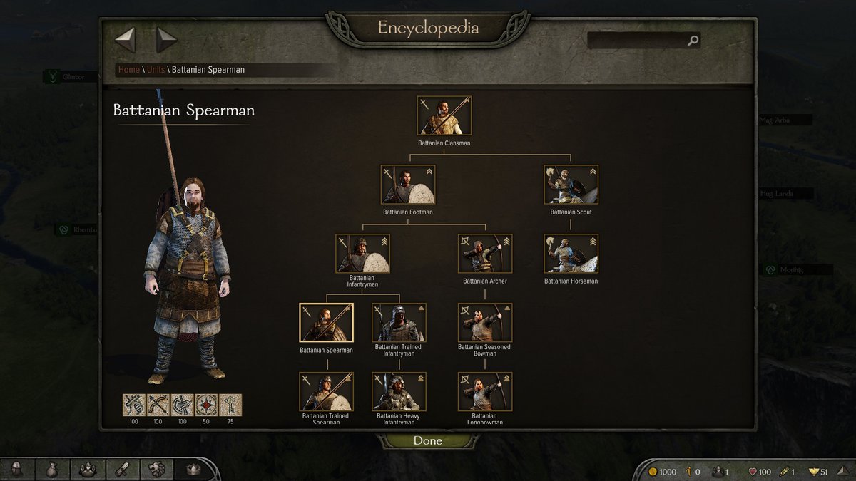В разделе Армии можно спланировать развитие своего войска. Здесь для каждого юнита, присутствующего в Mount & Blade 2 Bannerlord, показывается древо развития с описанием возможных вариантов прокачки и характеристиками юнита на каждом этапе.