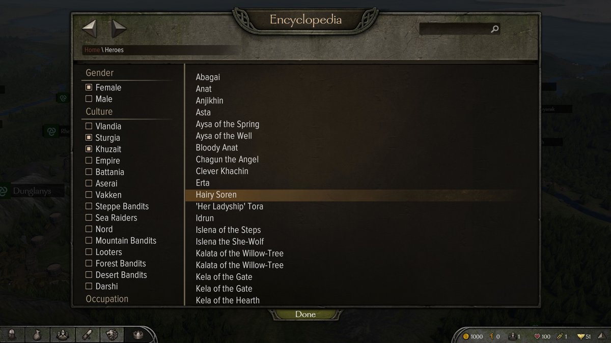Первым делом в энциклопедию добавили поиск. В Mount & Blade Warband игрокам приходилось постоянно пролистывать списки в поисках нужного названия или имени, а в Bannerlord можно просто ввести часть названия и выбрать нужный элемент из списка.