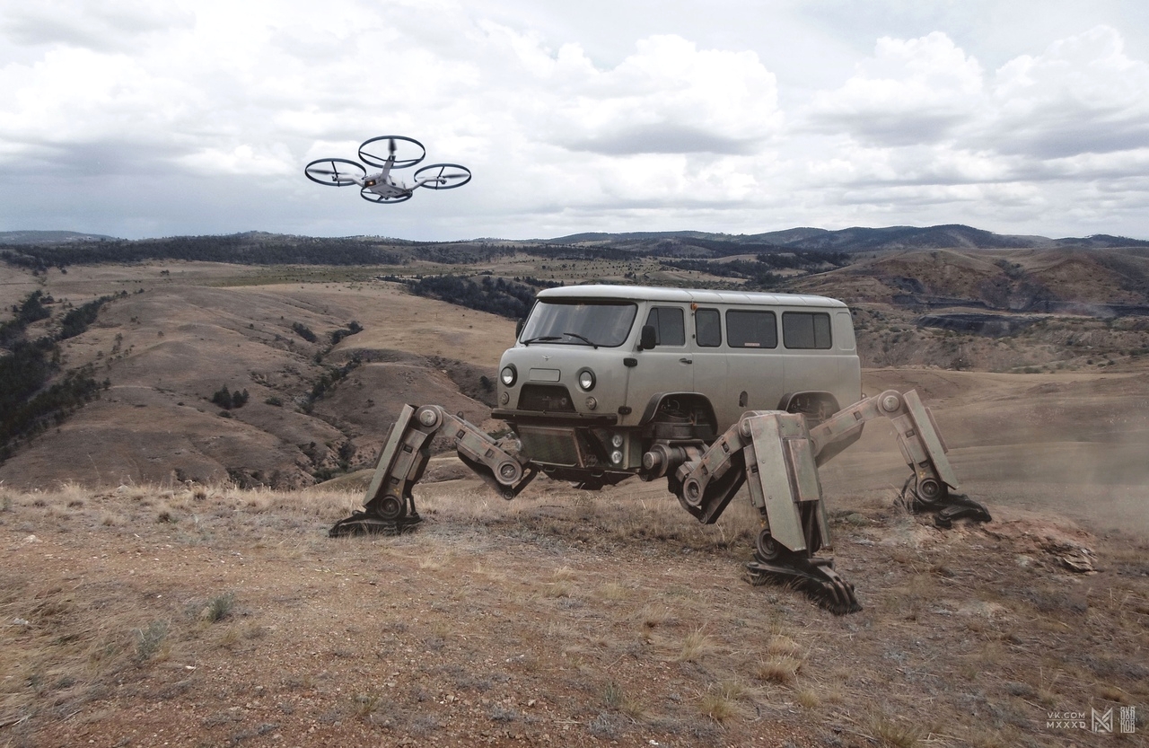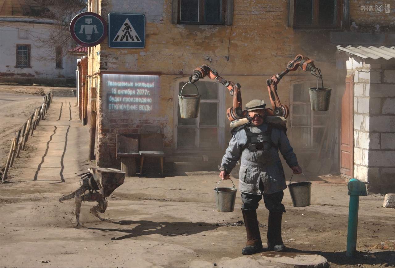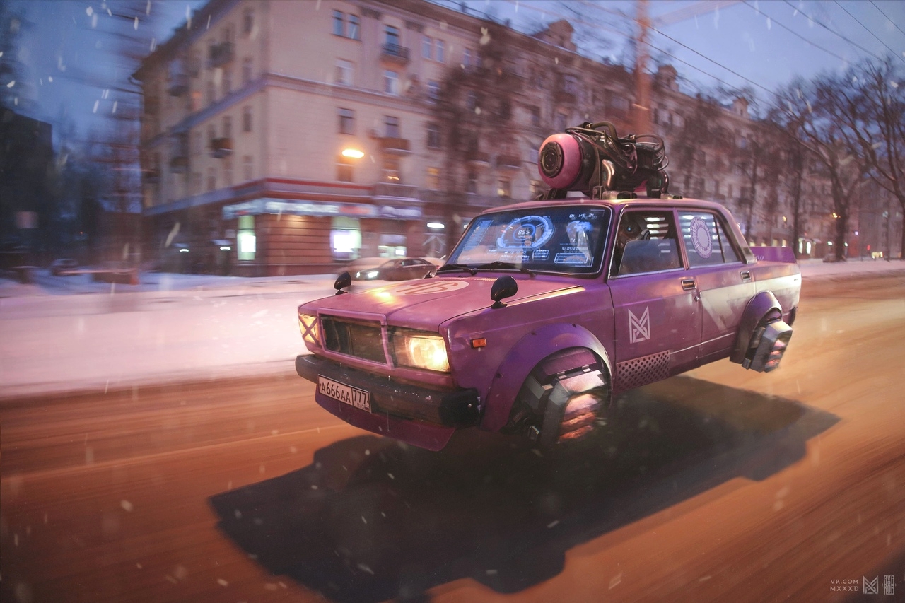 Художник Евгений Зубков создал серию артов под общим названием Russia 2077: здесь есть и летающие машины, и многочисленные аугментации, и дроны, помогающие по хозяйству.