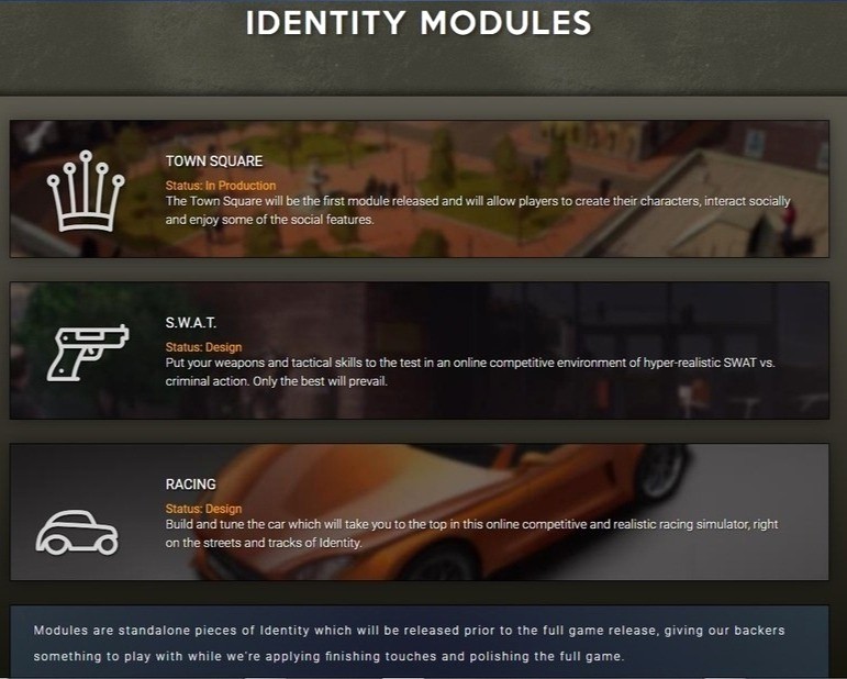 Модули - это отдельные элементы Identity, которые будут выпущены за период, пока игра будет в Early Access.