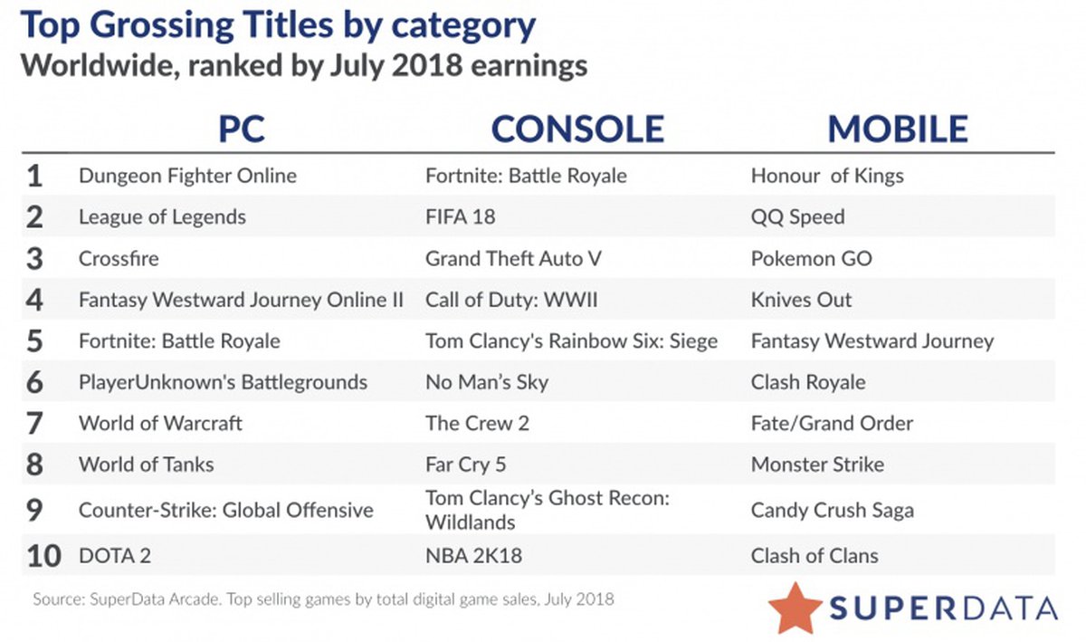 Аналитики SuperData Research опубликовали отчет о состоянии цифрового рынка игр в июле 2018 года. За месяц объем рынка вырос на 3%, до $8.2 миллиардов, прирост обеспечили в основном игры для консолей. По сравнению с прошлым годом выручка игр для PC уменьшилась на 14%.
