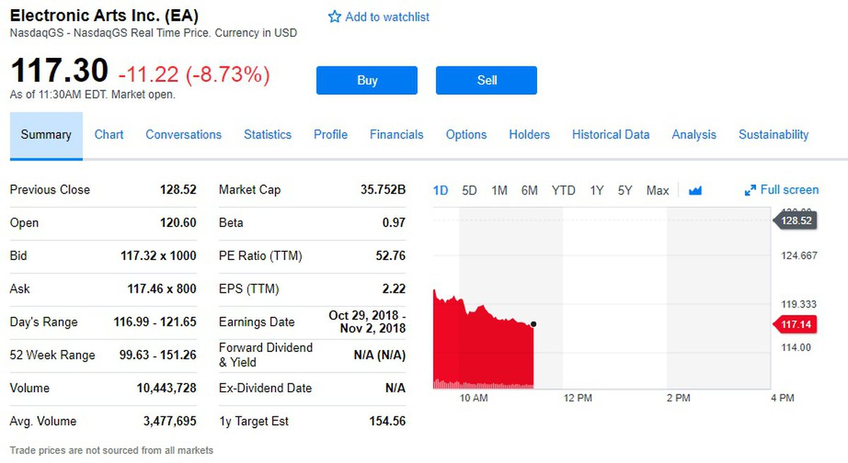 В CNBC обратили внимание, что сразу же после открытия торгов (когда EA объявили о переносе Battlefield V в США было утро) стоимость акций издателя пошла вниз. Прямо сейчас акции Electronic Arts торгуются на 8.73% дешевле, чем при закрытии рынка в среду.