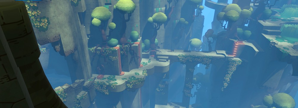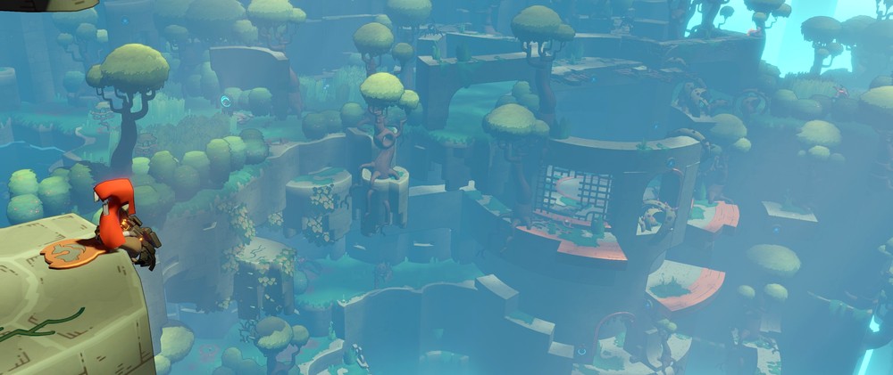 Первое, что доставляет - цветовая палитра. Симбиоз стимпанка и фауны достаточно красочен, порой хочется просто остановиться и любоваться утопающими в зелени руинами. Если и существует удовлетворение, вызванное балансом цвета, то я нашёл его тут. Особенно понравились переходы от ярких локаций к пещерной темноте, в последний раз такое удовольствие от контраста я испытывал, наверное, в игре про Марио.