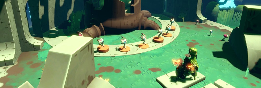 Всё начинается, как всегда, внезапно. Большой голем, местами похожий на Бастиона из Overwatch, открывает дверь нашей пещеры и знаками предлагает следовать за ним. Вот так просто, без введения, без объяснений. Забегая наперёд, скажу, что их и не будет, сюжет в Hob подаётся посредством изучения мира и за всю игру вы не услышите ни слова. История ещё впереди, нам предстоит её раскрыть, но она с самого начала подкупает своей простотой. Есть мир, полностью созданный роботами, есть дикая природа, что наполняет этот мир буйством красок и есть непонятная фиолетовая хреновина, которая убивает всё, к чему прикасается. В общем, спасаем планету, хоть и не знаем почему.