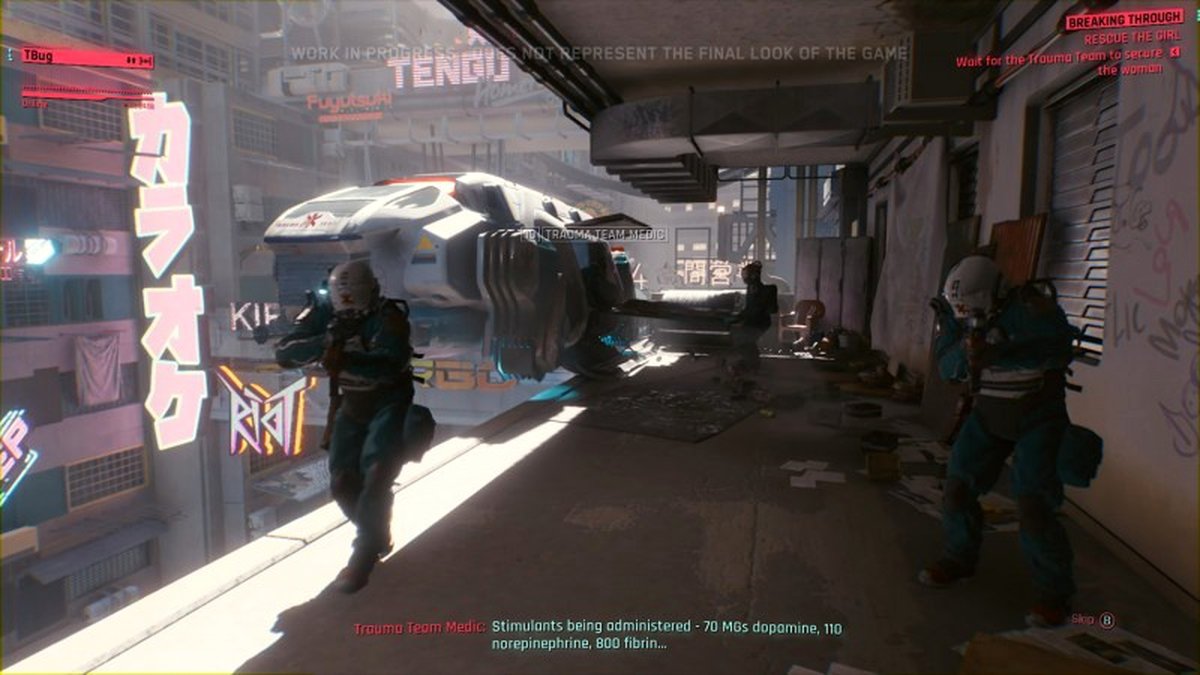В первой миссии, мы видим V и её друга Джеки. Они спасают женщину, которая была украдена с целью сбора модификаций. Герои находят её, плавающей в ледяной ванне (городские легенды никогда не умрут), а потом, словно в кибер версии "Криминального Чтива", воскрешают при помощи шприца в сердце. Так же, они узнают, что у жертвы есть страховка Trauma Team Platinum. V вытаскивает женщину на балкон, где уже ожидает команда скорой помощи. И ребята этой скорой настоящие засранцы. Они выхватывают женщину из рук, отталкивают V и держат под прицелом. А потом просто улетают, не сказав и слова благодарности. Кажется, платиновая страховка не покрывает основы человеческой порядочности. Господи боже.