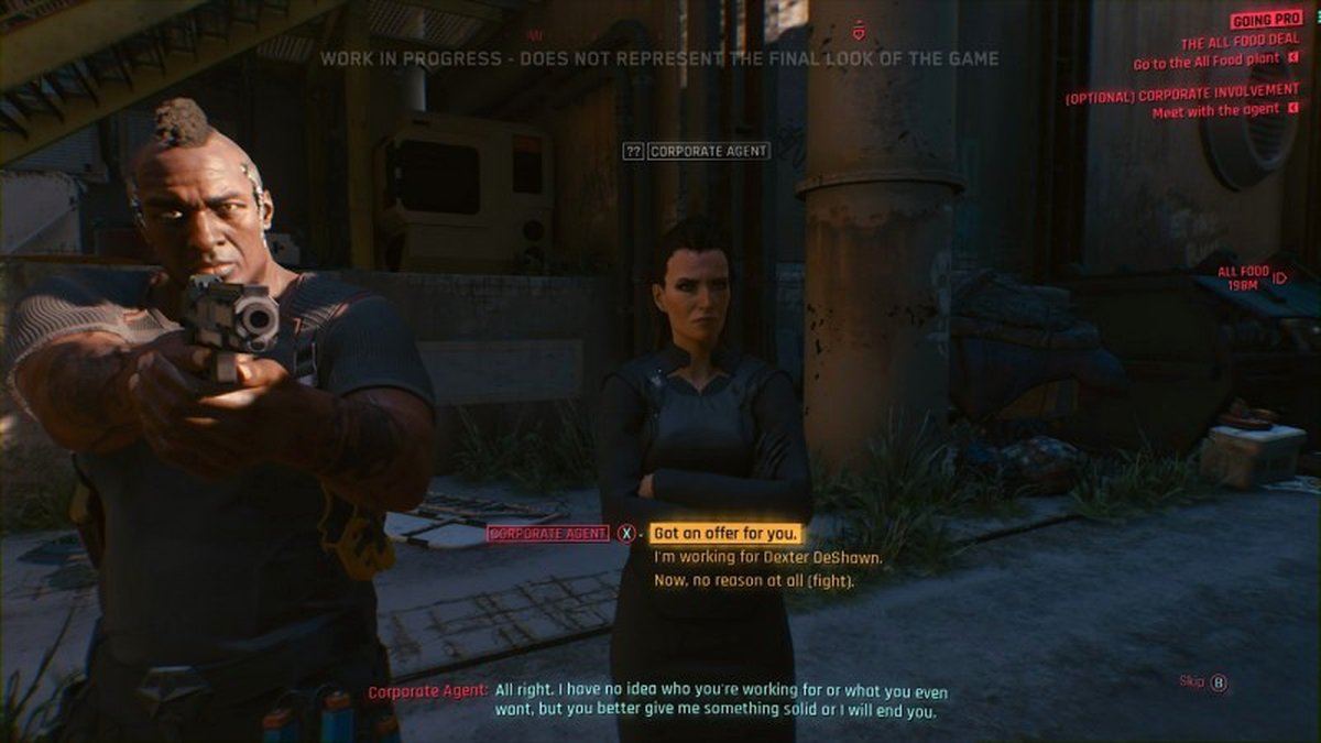 Кусочек геймплея показал нам момент, когда V пытается наложить руки на какое-то высокотехнологичное оружие. Игроку надо принять несколько решений, которые повлияют на исход событий. Одно такое решение приведёт к тому, что мы встретим женщину, которая работает на мегокорпорацию под названием Милитек. V соглашается на сделку с этой леди, стремящейся выкупить оружие, однако это приводит к перестрелке с покупателем. V может убить женщину и её охрану, а может просто убежать с деньгами. Или, предположим, может потратить кучу времени, шатаясь по городу и совершенно игнорируя все основные задания. Догадайтесь, что бы я выбрал?