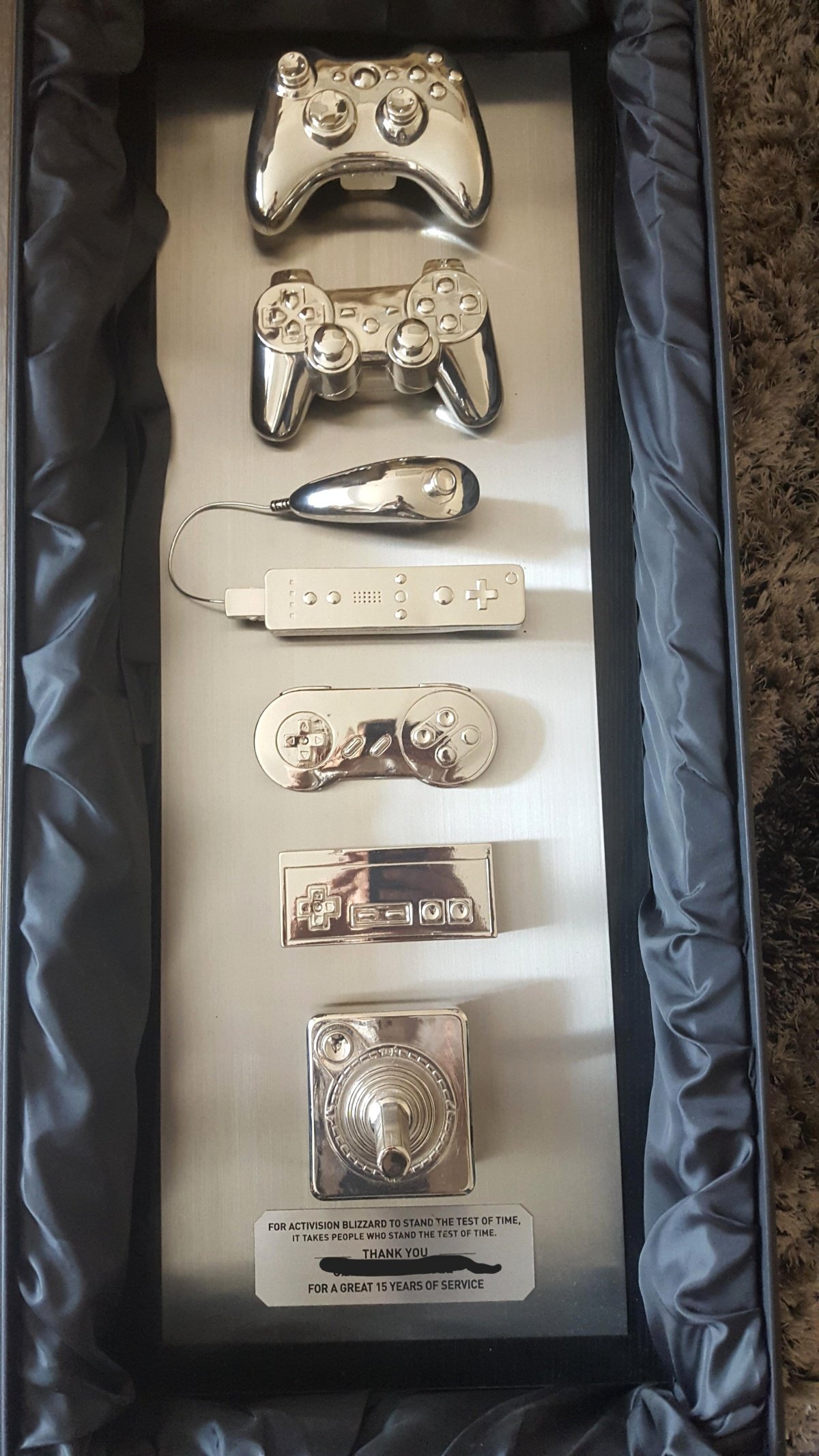 Реддитор MaxTurnbull опубликовал фотографию награды, полученной его отцом за 15 лет работы в Activision Blizzard. Наградой стала металлическая пластина с закрепленными на ней репликами геймпадов и контроллеров.